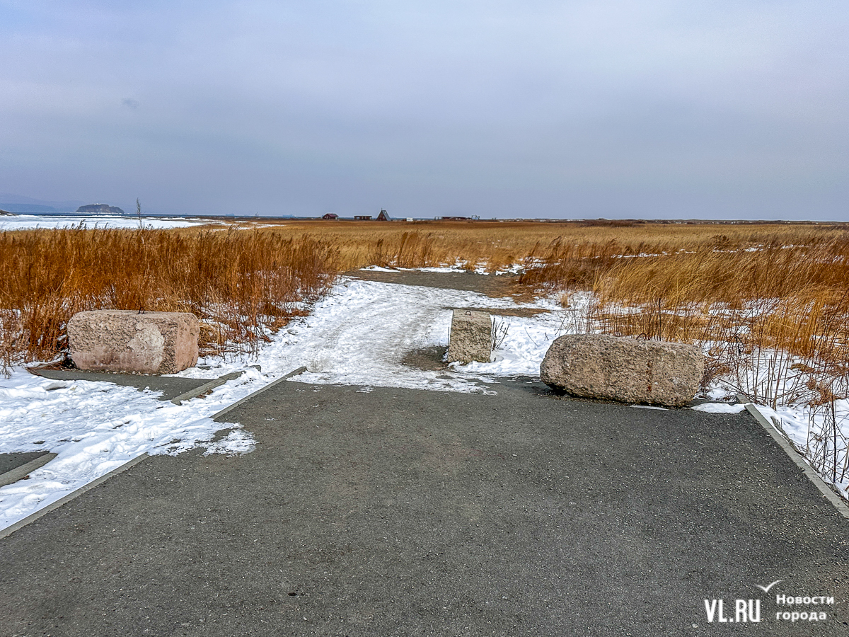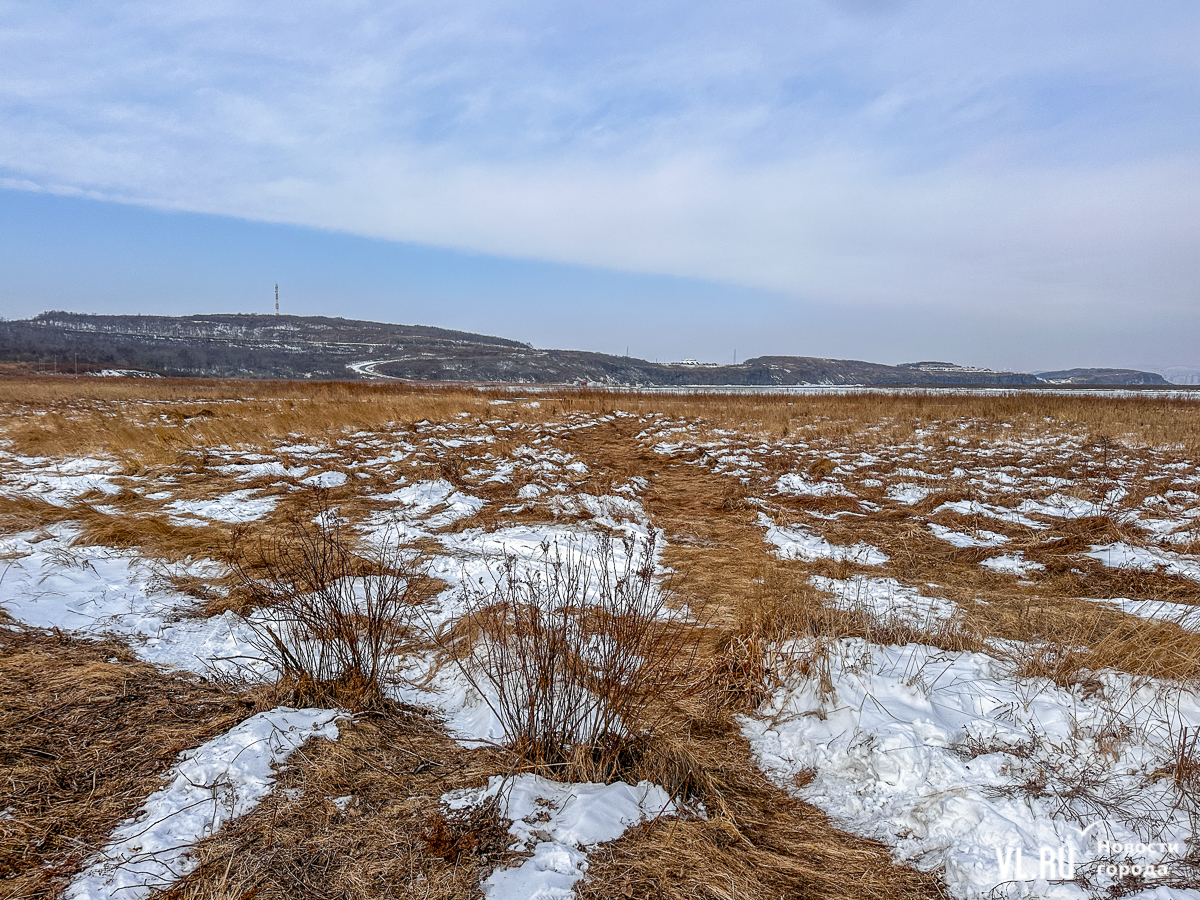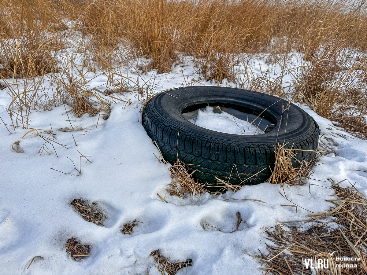 Пешеходная дорожка ведёт не к озеру, а заканчивается тупиком в поле. Дрифтеры едут по нему, их следы видно по примятой траве и на снегу, а в поле и по берегам водоёма валяются автомобильные покрышки. При этом выезд на лёд в Приморье запрещён – прокуратура заинтересовалась даже соревнованиями по ледовому ралли в Угловом.