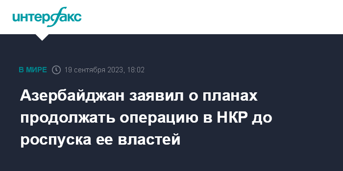 "Для прекращения антитеррористических мероприятий незаконные армянские вооруженные формирования должны поднять белый флаг, сдать все оружие, а незаконный режим должен самораспуститься. В противном случае антитеррористические мероприятия будут продолжены до конца", - говорится в тексте заявления администрации, которое поступило в "Интерфакс".