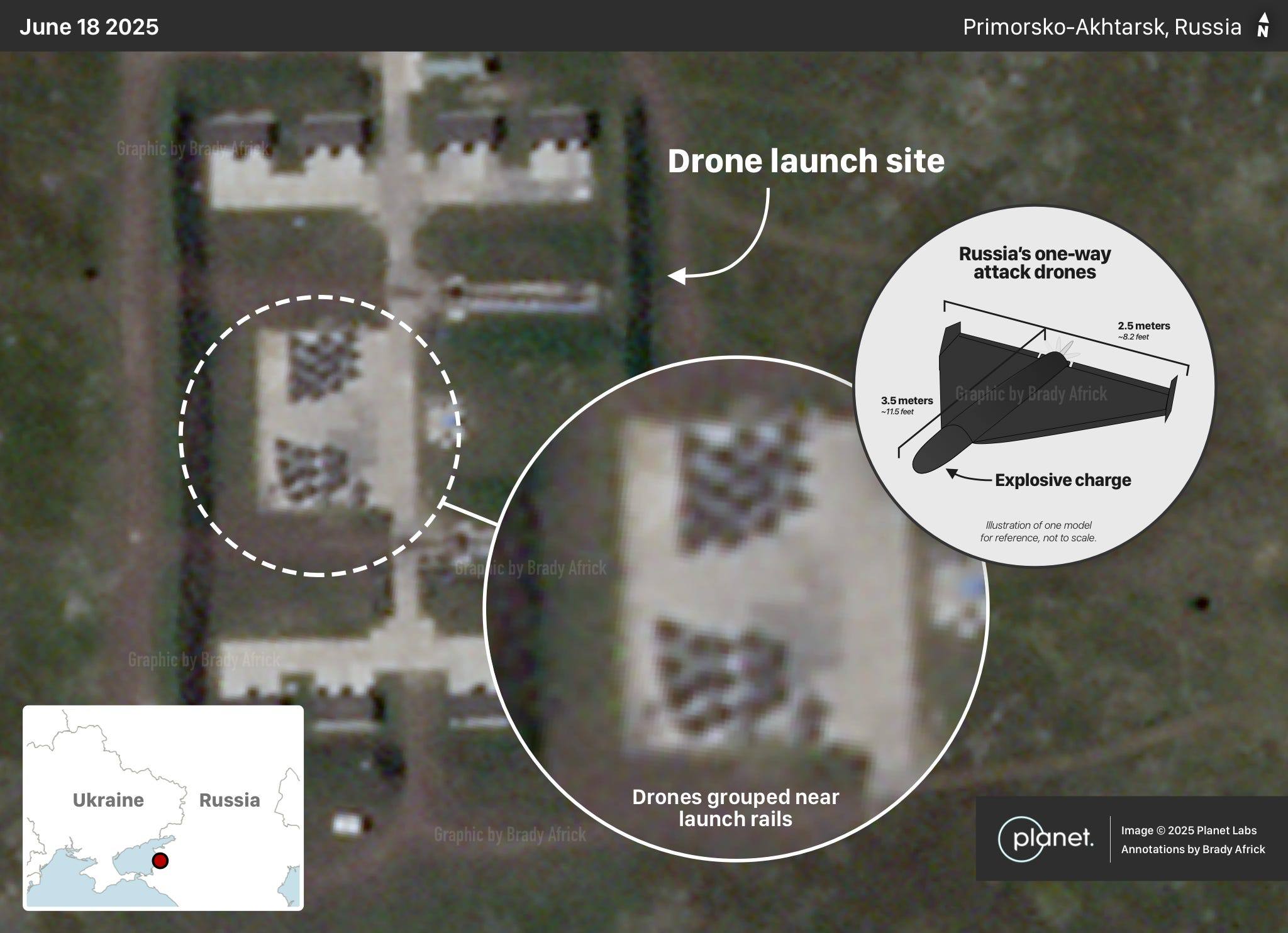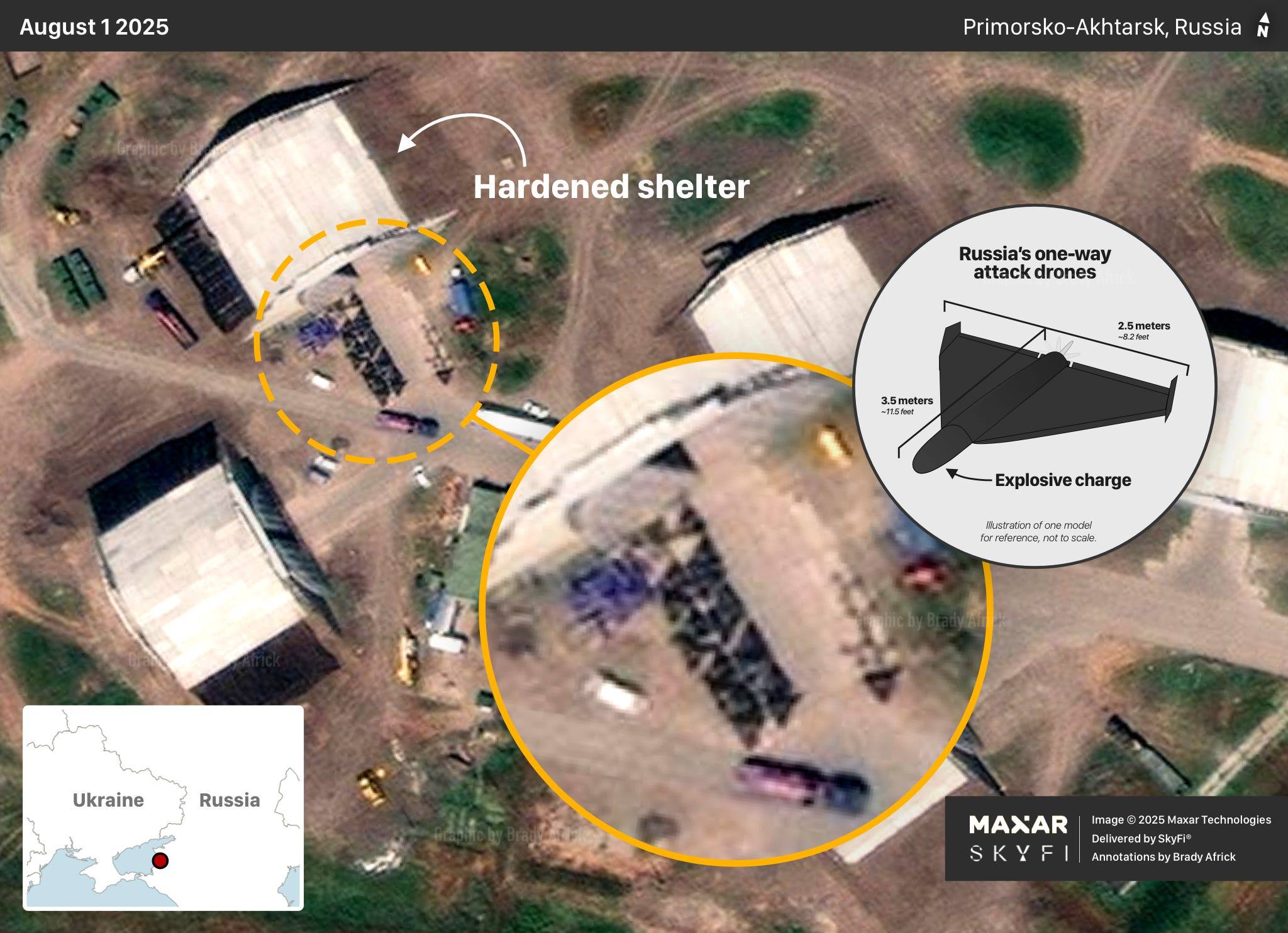 На снимках представлены защищённые хранилища дронов, множество подготовленных к запуску дронов и пусковые установки со следами от стартовых реактивных ускорителей. На других аэродромах запуск дронов осуществляется с пикапов и катапульт.