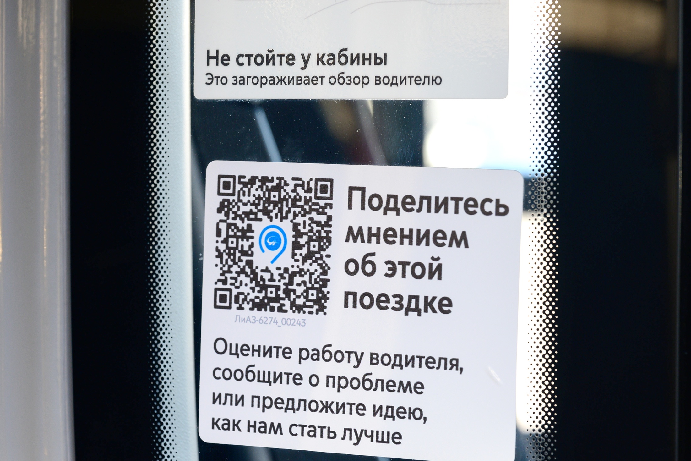 Найти стикер с QR-кодом просто, он размещен на кабине водителя и в салоне автобусов и электробусов.