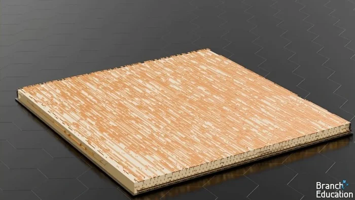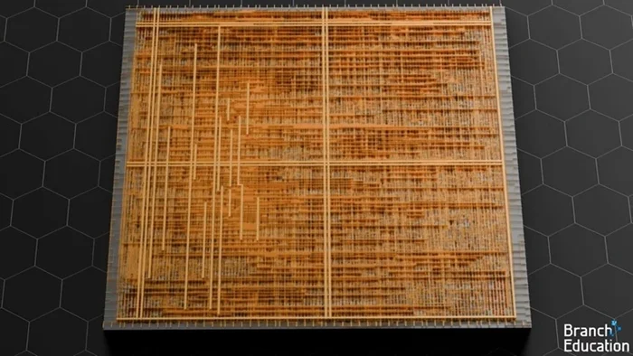 Это упрощенное представление, включающее слой транзисторов и пять слоев соединений. Всего в процессоре 17 слоев соединений, расположенных друг над другом. Внизу расположены локальные соединения между компонентами ядер, посередине — соединения вокруг ядер, на самом верху — глобальные соединения между разными компонентами ЦП. Чем ближе слой к верху, тем крупнее становятся соединяющие линии.