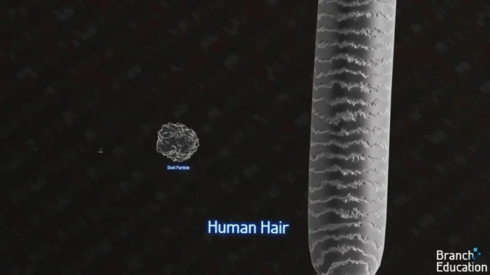 Чтобы представить себе размер такого транзистора, можно сравнить его с митохондрией, частицей домашней пыли или человеческим волосом. Транзистор — это первая белая точка слева, митохондрия — вторая.