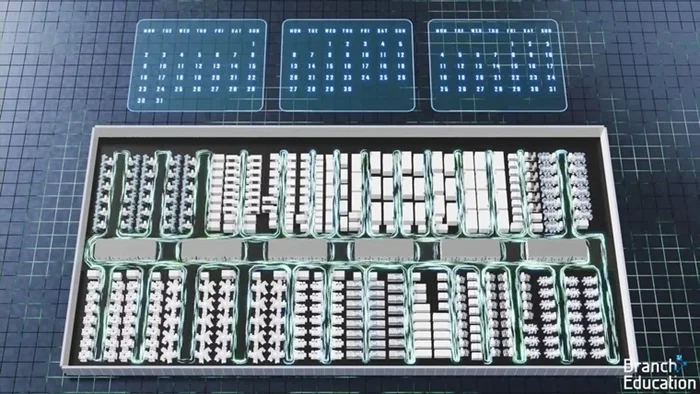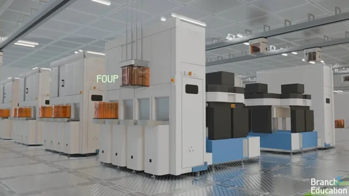 Пластины перевозятся стопками по 25 штук в специальном герметичном контейнере (FOUP), которые передвигаются по производственному помещению благодаря подвесной транспортной системе. С нее контейнеры опускаются на загрузочную площадку принимающей установки.