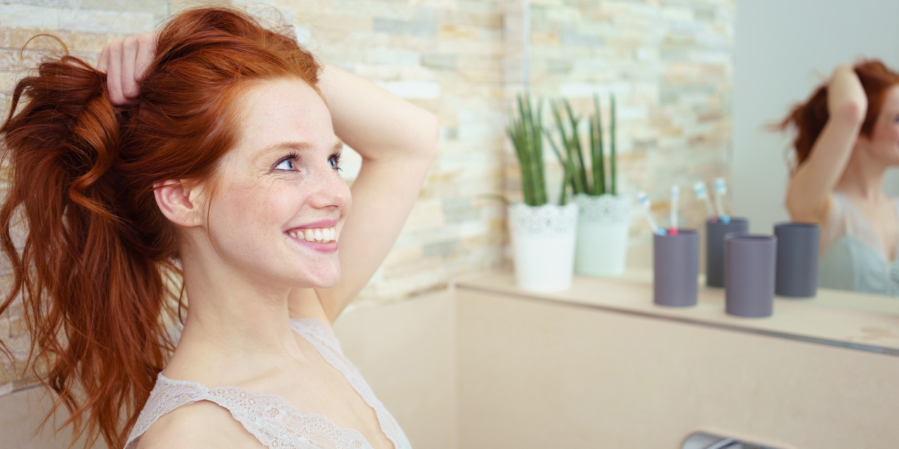 Разделите волосы в хвосте на две части: нижнюю и верхнюю. На первую прикрепите крабик и накройте её второй. Это сделает причёску более пышной.