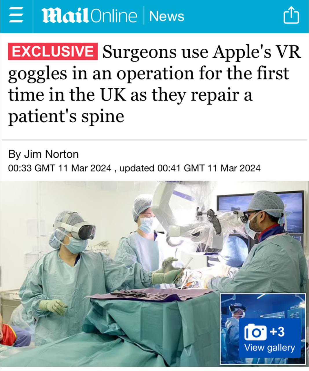 Хирурги в Великобритании использовали очки Apple Vision Pro во время операции на позвоночнике, — Daily Mail