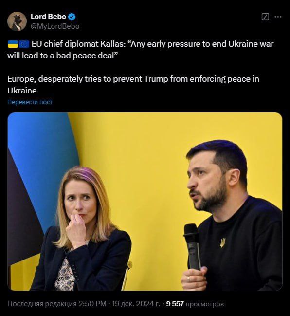 "Глава евродипломатии Кая Каллас: "Любое преждевременное давление, направленное на прекращение украинского конфликта, приведет к плохому мирному соглашению".