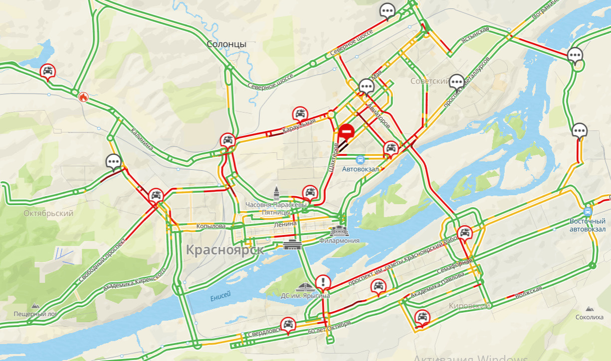 Как всегда, сложнее всего на левом берегу. Водители «толкаются» на Высотной в обе стороны, на Свободном, где гора с госуниверситета, Маерчака, Брянской — также в обе стороны, стоит и Шахтеров в гору, есть пробка на Северном шоссе, Взлетке, особенно в районе ТРЦ «Планета». Пробка образовалась на Октябрьском мосту в сторону правобережья. На правом же более-менее спокойно: стоит Красраб в сторону Предмостной, Семафорная и Матросова.