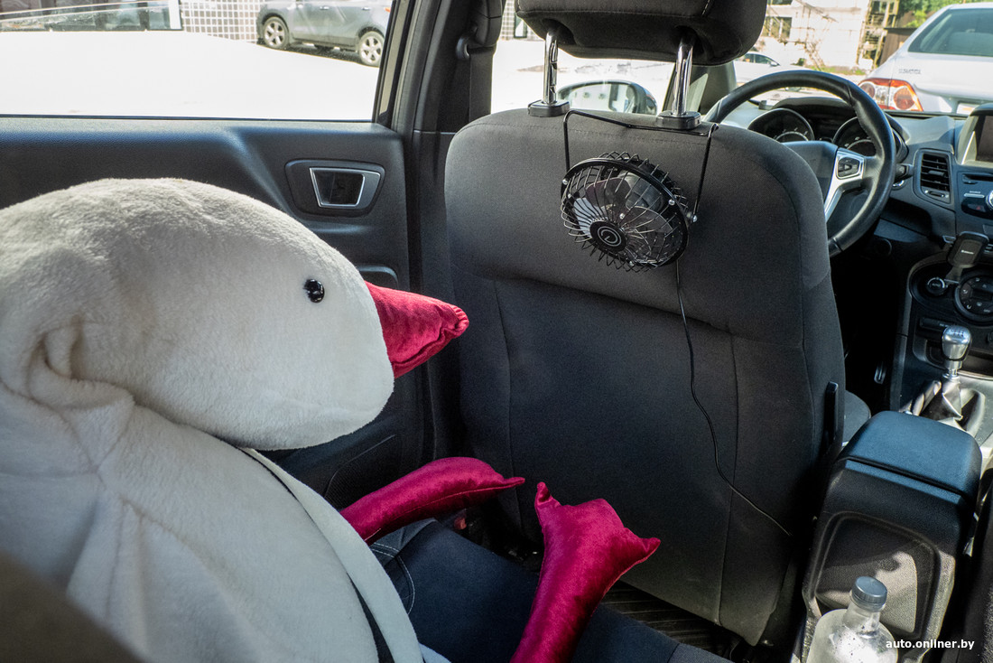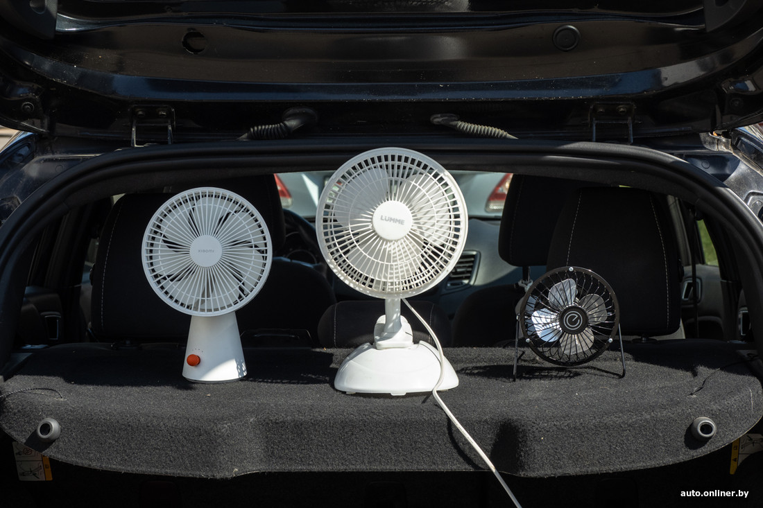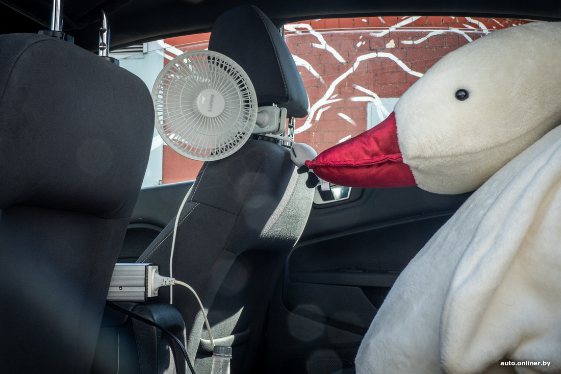 А вот в машине — увы. Температура на клюве если и изменилась, то не более чем на градус (или это ветер подул в приоткрытое окошко?). Да и по ощущениям когда направляли вентилятор себе на лицо, никакой прохлады от него не получали.