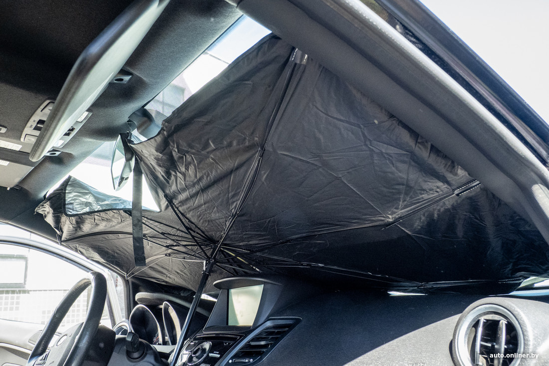 К нам в руки попал интересный вариант экрана, который раскрывается как зонт. Что-то в этом есть: в сложенном виде такой девайс занимает совсем немного места, к работе готов за считанные секунды, а в салоне крепится в распор оконного проема. Но по части эффективности он ничем не отличается от традиционных экранов.