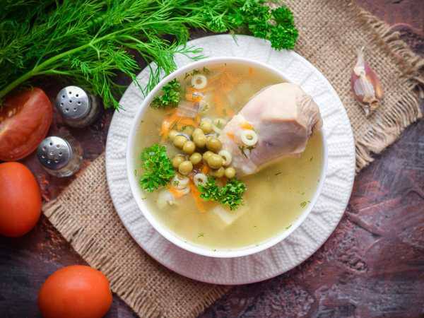 4․ Поставьте бульон на плиту. Добавьте замороженный горошек и дождитесь закипания.