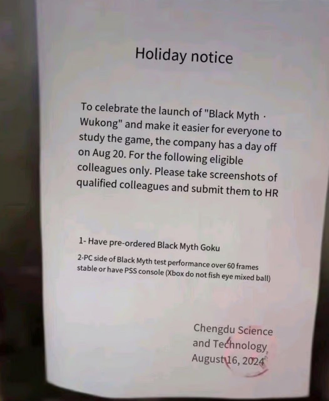 В Китае компания дала сотрудникам выходной на «изучение» новой хитовой игры Black Myth: Wukong.