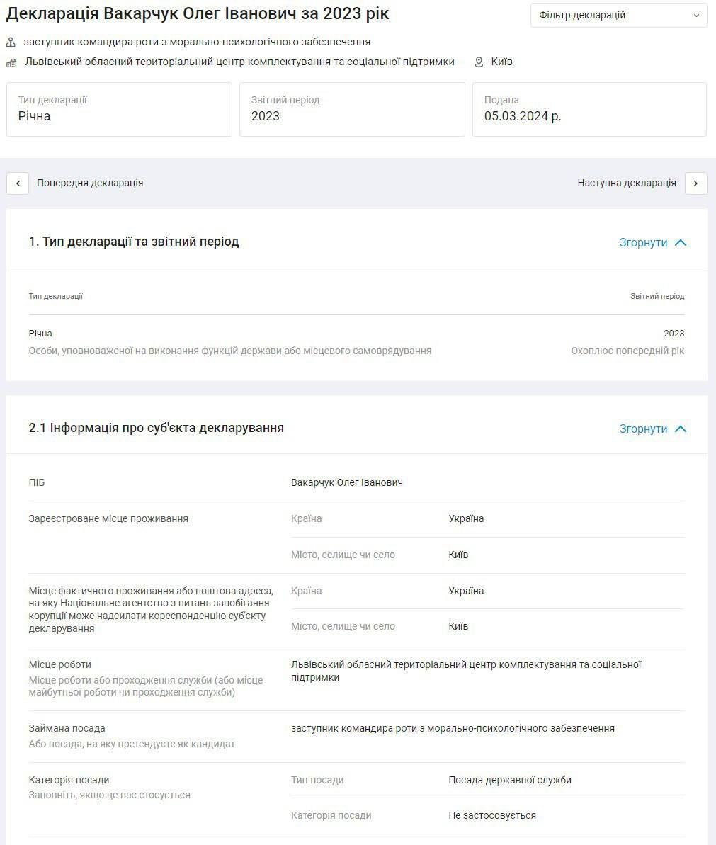 Младший брат вокалиста группы "Океан Эльзы" Святослава Вакарчука Олег числился во Львовском областном ТЦК в должности заместителя командира роты по морально-психологическому обеспечению и уволился после двух лет службы в феврале 2024 года. Об этом свидетельствуют данные его электронной декларации.