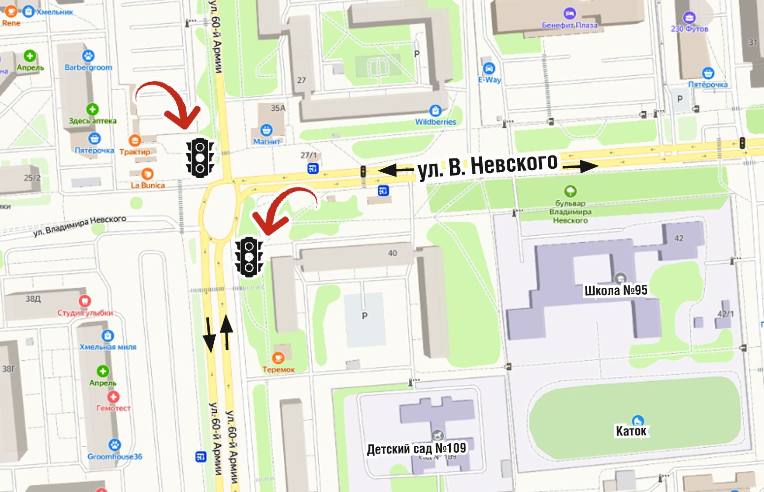 От улицы Владимира Невского до Хользунова путь проходит по улице 60-й Армии. На участке от бульвара Победы до Хользунова магистраль становится 6-полосной, с тротуарами и велодорожкой.