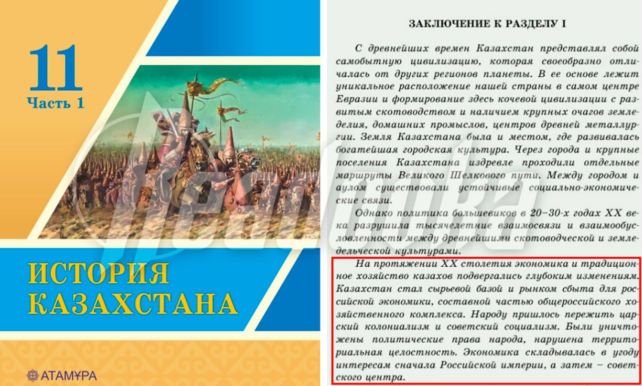 В 2022 в Казахстане приступили к обновлению программы среднего образования, изменив в том числе курс истории. В прошлом году разработчик нового издания учебников по истории Казахстана Алтын Уалтаева на пресс-конференции анонсировала поправки для пособий, которые еще сильнее будут убеждать юных казахов в том, что Россия — это враг. В учебнике для 11 класса Российская империя или Советский Союз ни разу не упоминаются в позитивном контексте, более того, даже нейтральными оценки казахстанских историков нельзя назвать. Пособие неприкрыто навязывает мысль о том, что политическая нация в Казахстане была уже тогда, в ХIХ веке, и сама страна никогда не считала себя частью ни Российской империи, ни Советского Союза.