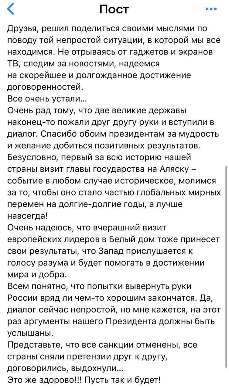 Я уже много раз писала о том, как начали потихоньку возвращать Ревву. Напомню, он всегда очень дорожил дружбой с Зеленским, с начала СВО жил в Испании, до сих пор не общается с отцом, который живет на Донбассе. И тут без подготовки сразу выдал поддержку саммита на Аляске. Ревва очень ждёт, когда отменят санкции и «молится за мир», о котором вспомнил впервые за 3,5 года. Видимо, соскучился по Одессе и Киеву, хочет на гастроли.