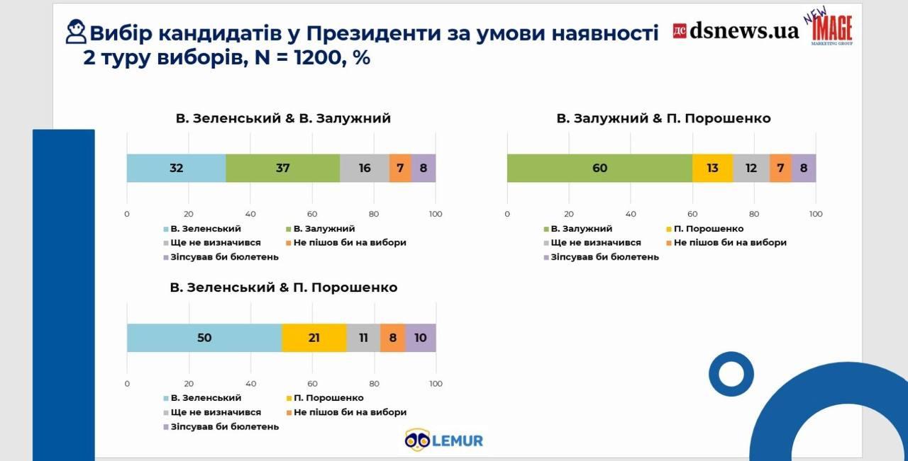 Согласно свежему опросу New Image Marketing Group, уровень доверия к Зеленскому продолжает снижаться. Он уже на третьем месте — уступает и экс-главкому ВСУ Валерию Залужному, и главе ГУР Кириллу Буданову. Залужному доверяют 70% респондентов, Буданову — 65%, а Зеленскому — лишь 58%. Если бы президентские выборы прошли сейчас, Зеленский получил бы 28,9% голосов в первом туре, Залужный — 16,7%. Однако во втором туре ситуация меняется: победу одерживает Залужный — 37% против 32%.