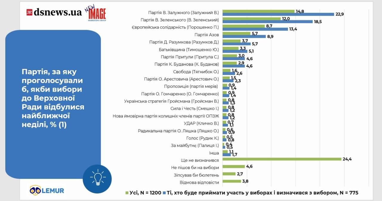 Интересна и парламентская динамика: гипотетическая партия Залужного возглавляет рейтинг с 22,9%, партия Зеленского отстаёт с 18,5%, третье место — у Порошенко (13,4%). Проходят в парламент также партия «Азов» (8,9%), Разумков (5,7%) и «Батькивщина» Тимошенко (5,1%).
