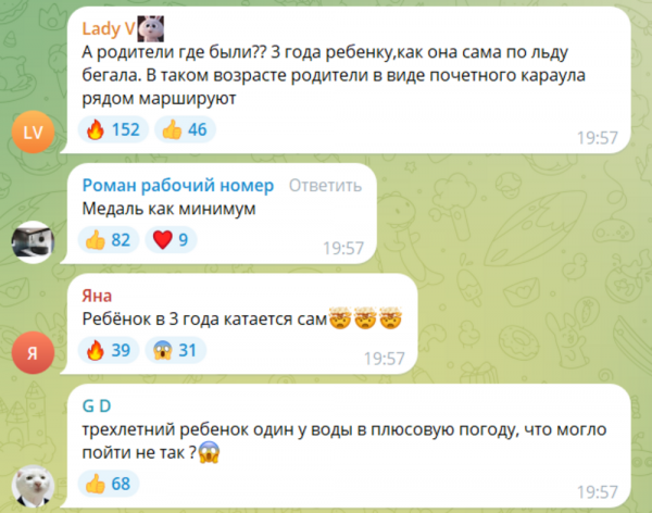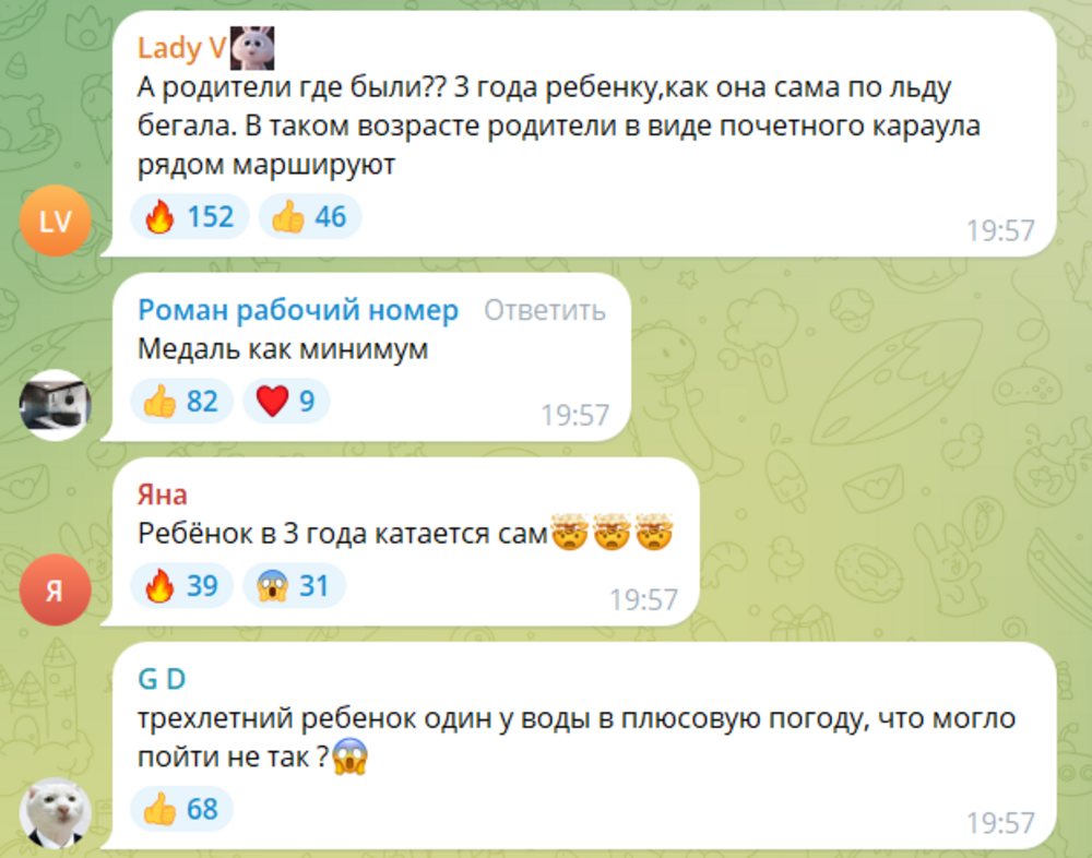 Что касается родителей девочки - вероятно, им предстоит беседа с товарищами из органов. Чтобы в будущем не отпускали ребёнка носиться по льду и рисковать жизнью.