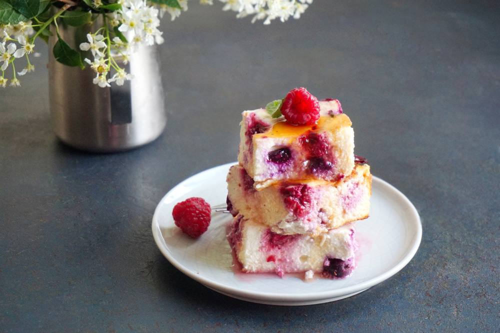3․ Разлейте йогуртовую смесь по формам, сверху выложите ягоды. Выпекайте 25–30 минут, пока масса не загустеет.