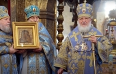 Сегодня мы все являемся свидетелями очень важного исторического события. Этот день можно назвать обретением чудотворного образа Божией Матери, Казанского и Московского. Хотя образ был обретен раньше, но он никогда не был представлен людям, а находился в Патриаршей келье, потому что многое нужно было выяснить, перед тем как сказать, что это тот самый чудотворный образ, перед которым молился князь Пожарский, который был великой святыней в самое опасное время нашей истории. Имею в виду средние века, когда решалась судьба России, когда враг, поляки, находились в Москве и избавление от этого врага означало, будет ли Россия свободной страной или окажется в вечной зависимости от иноземцев.