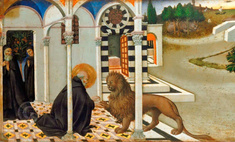Сано ди Пьетро, видный представитель сиенской школы живописи итальянского Возрождения, создал одну из самых узнаваемых версий этого сюжета, в наши дни разошедшуюся на мемы благодаря комичному выражению морды животного. Для средневековой живописи не редкость, когда разные эпизоды истории с повторяющимися персонажами изображаются на одном и том же пространстве. Три части сюжета о льве и святом последовательно показаны по ходу взгляда человека, привыкшего читать слева направо.