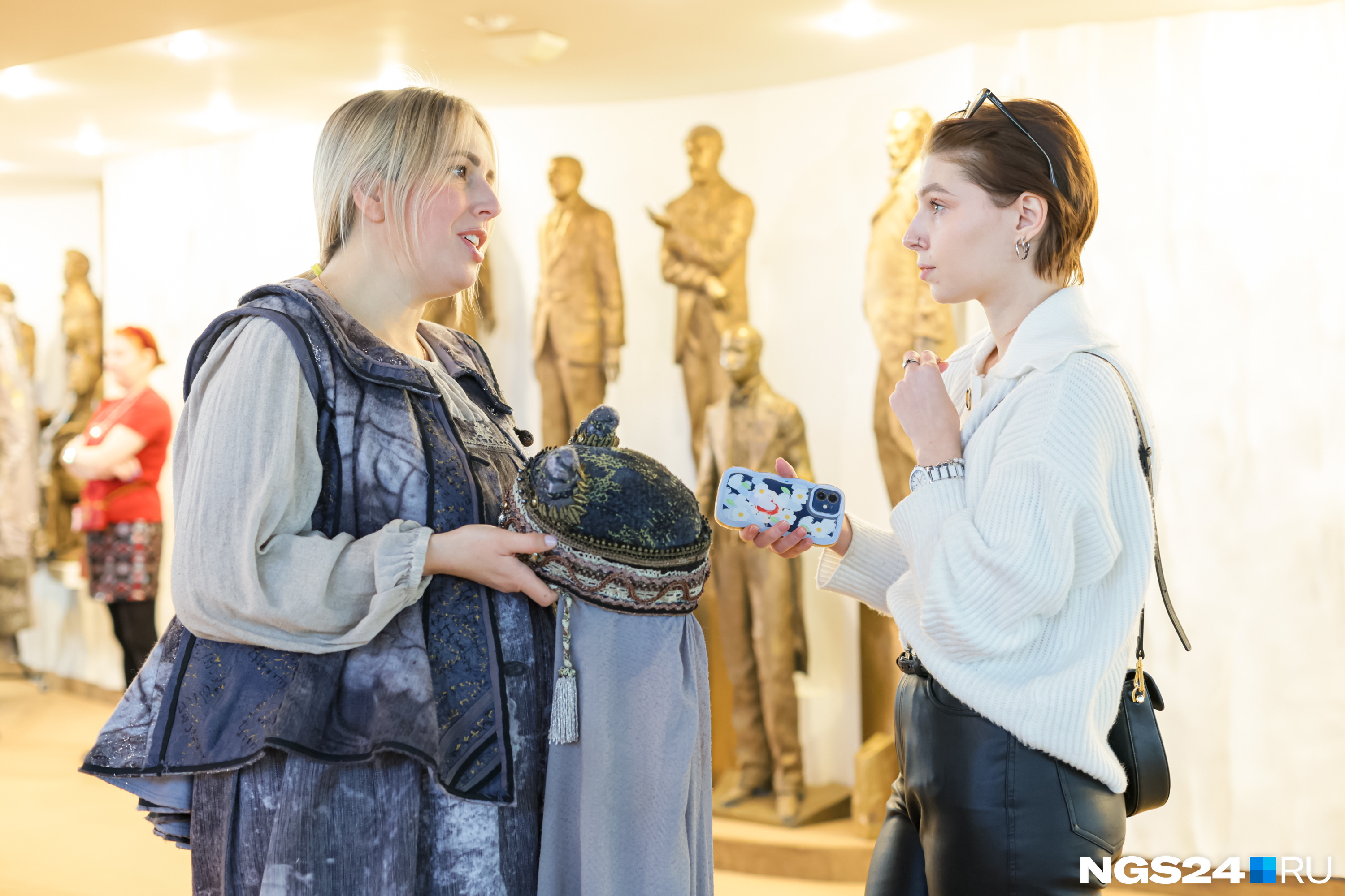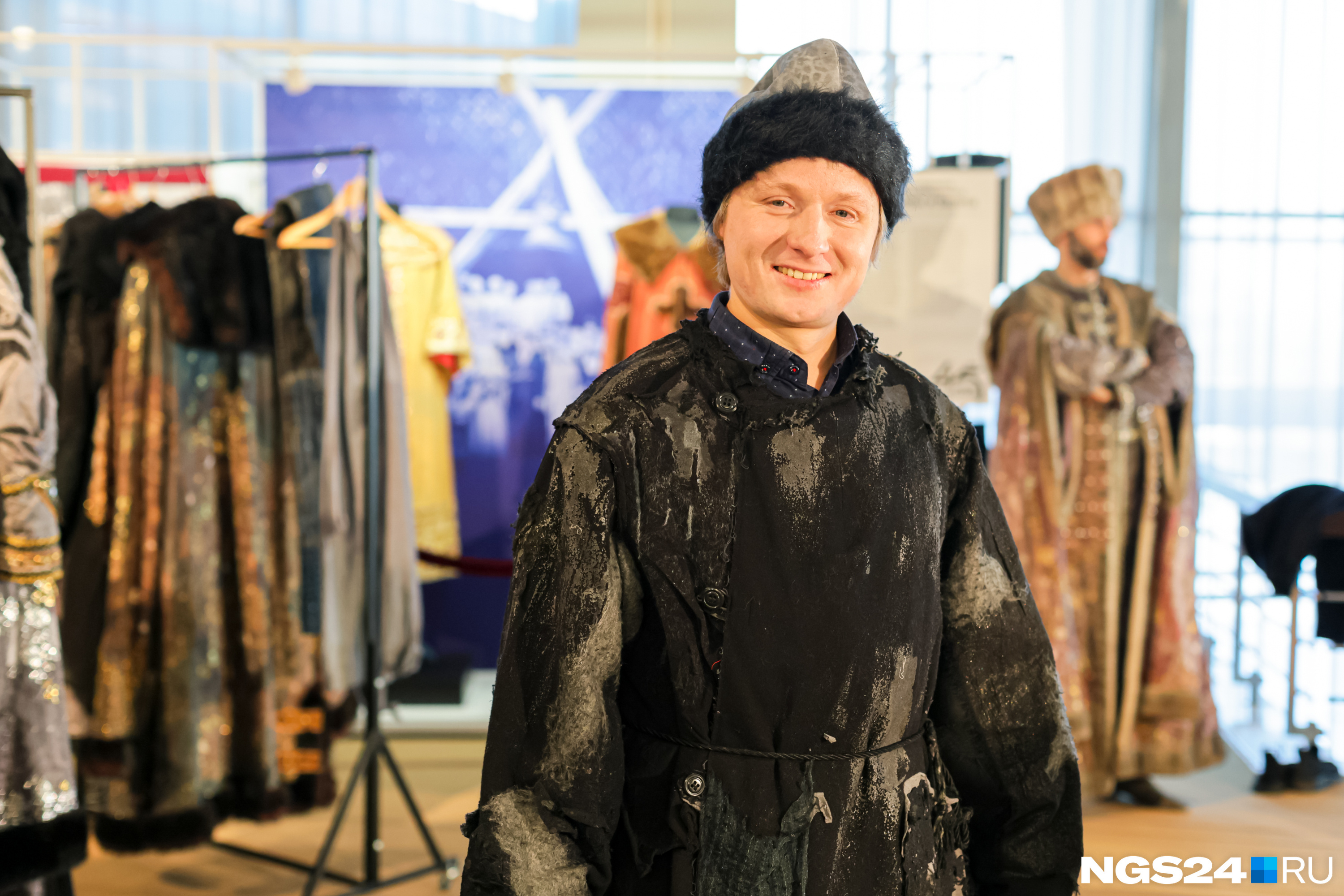 Еще одна звезда — Валентин Колесников, он в наряде Юродивого. На фоне богато расшитых тканей лохмотья действительно бросаются в глаза. Важная часть костюма — железный колпак и кандалы. Наша корреспондентка примерила аксессуары, они действительно легкие, правда, за колпаком приходится следить, чтобы он не съехал, но кандалы совершенно не давят и не натирают.
