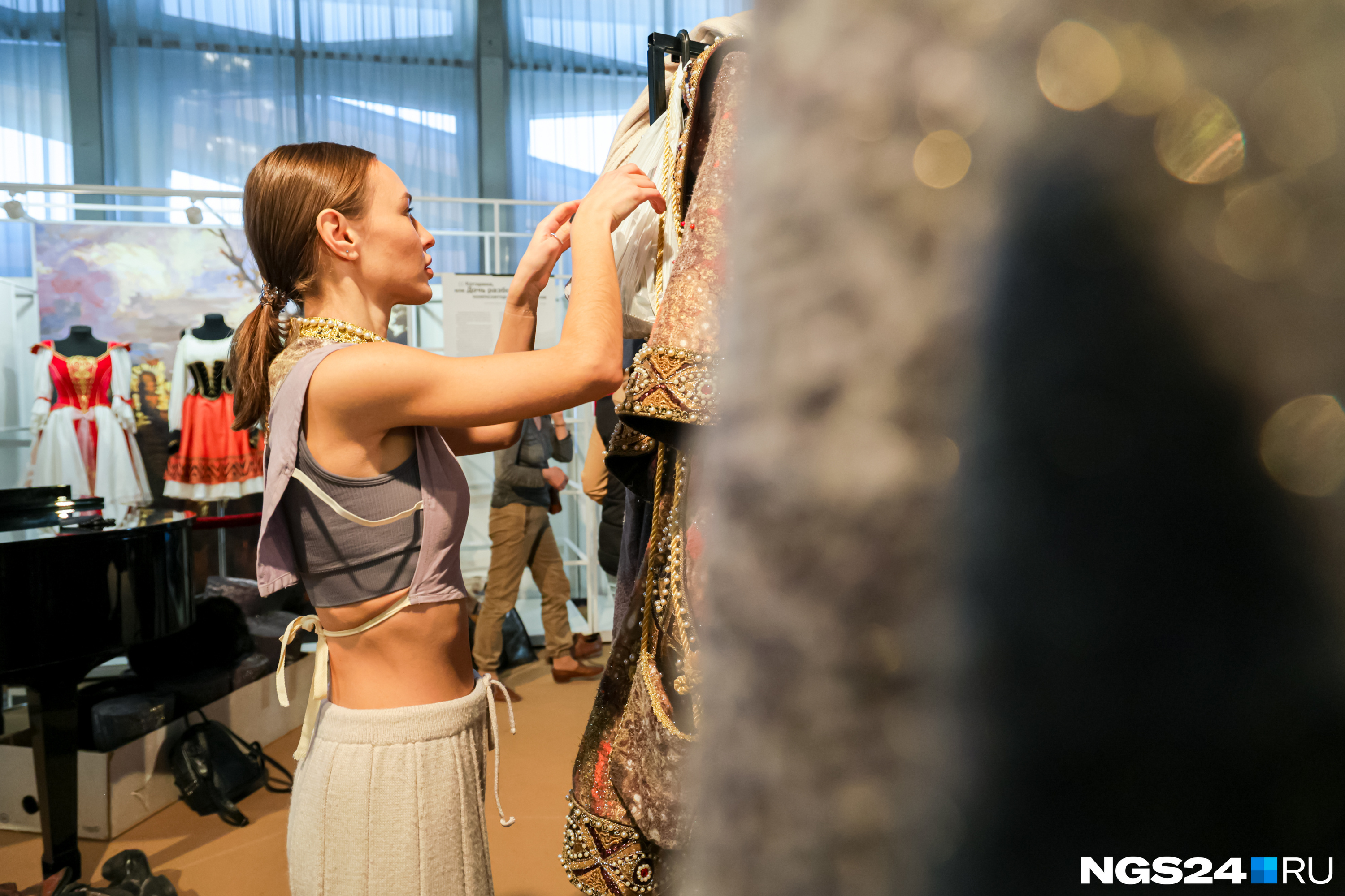 Примерка костюмов была запланирована на обеденное время. Вешалки с нарядами выставили в фойе второго этажа, около дверей, через которые зрители попадают в зал. Традиционно примерки проходят в костюмерных (но туда бы не поместились журналисты с камерами) или на сцене (но ее готовили к вечернему показу «Катарины»).