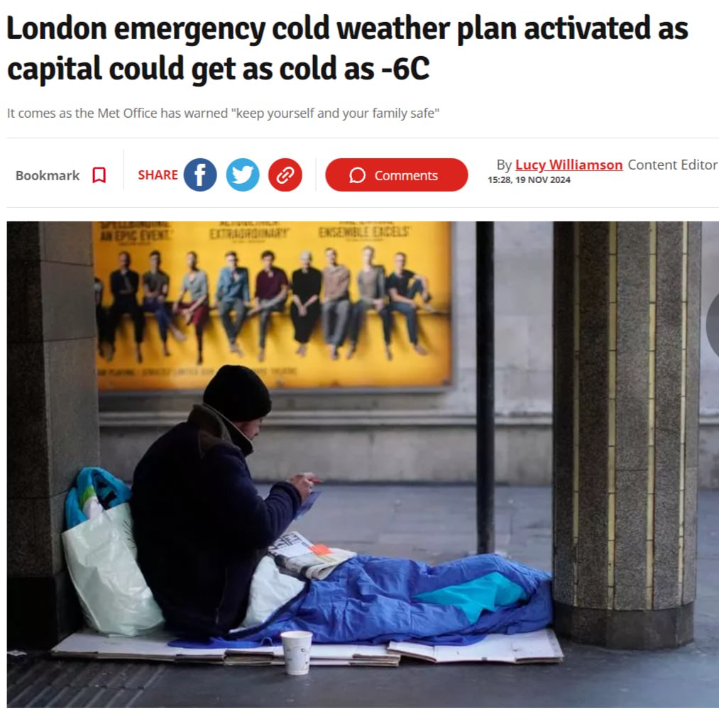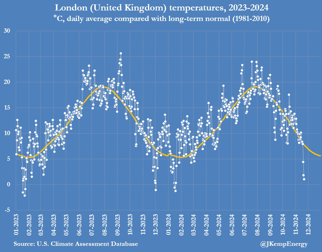 19 ноября в Лондоне был введен режим чрезвычайной ситуации из-за холодной погоды, так как температура опустилась до -6 °C. На 21 ноября в Лондоне температура опустилась на 7 °C ниже средних значения для этого времени года. Общий спрос на отопление вырос на 16%, относительно прошлых показателей.