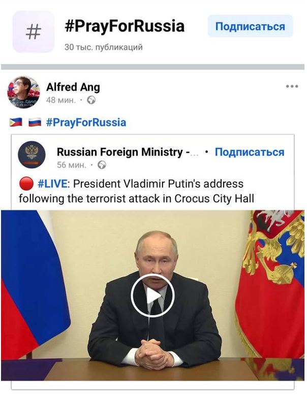 ππ»Π£ΡΠ°ΡΡΠ½ΠΈΠΊΠΈ ΠΠ€Π Π·Π°ΠΏΡΡΡΠΈΠ»ΠΈ Π°ΠΊΡΠΈΡ #prayforRussia (ΠΌΠΎΠ»ΠΈΠΌΡΡ Π·Π° Π ΠΎΡΡΠΈΡ). ΠΡ ΠΏΠΎΠ΄Π΄Π΅ΡΠΆΠ°Π»ΠΈ ΡΡΡΡΡΠΈ ΠΈΠ½ΠΎΡΡΡΠ°Π½ΡΠ΅Π², ΠΊΠΎΡΠΎΡΡΠ΅ Π½Π΅ Π±ΡΠ»ΠΈ ΡΡΠ°ΡΡΠ½ΠΈΠΊΠ°ΠΌΠΈ Π€Π΅ΡΡΠΈΠ²Π°Π»Ρ, Π½ΠΎ ΠΈΡΠΊΡΠ΅Π½Π½Π΅ ΡΠΊΠΎΡΠ±ΡΡ Π²ΠΌΠ΅ΡΡΠ΅ Ρ Π½Π°ΠΌΠΈ. Π ΡΠΎΡΠΈΠ°Π»ΡΠ½ΡΡ ΡΠ΅ΡΡΡ ΠΎΠ½ΠΈ Π²ΡΠΊΠ»Π°Π΄ΡΠ²Π°ΡΡ ΡΠ»ΠΎΠ²Π° ΠΏΠΎΠ΄Π΄Π΅ΡΠΆΠΊΠΈ ΡΠΎΡΡΠΈΠΉΡΠΊΠΎΠΌΡ Π½Π°ΡΠΎΠ΄Ρ ΠΈ ΠΎΡΡΠΆΠ΄Π°ΡΡ ΡΠ΅ΡΡΠΎΡΠΈΠ·ΠΌ Π² Π»ΡΠ±ΠΎΠΌ Π΅Π³ΠΎ ΠΏΡΠΎΡΠ²Π»Π΅Π½ΠΈΠΈ.