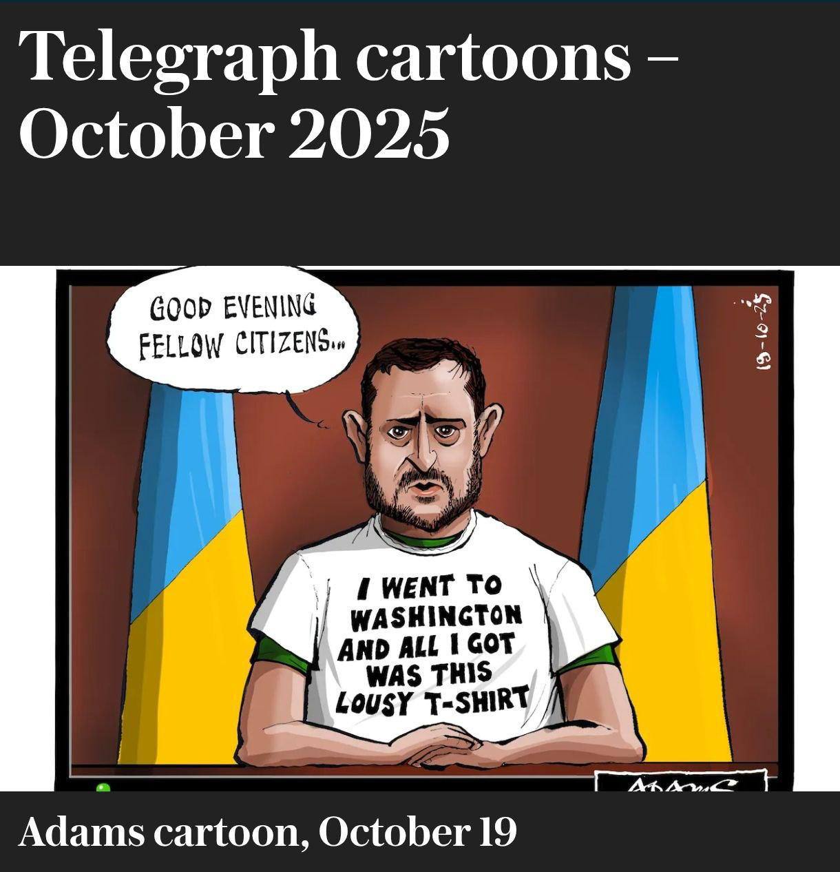Новое Издание11 часов назад ФОТО The Telegraph показала карикатуру на поездку Зеленского к ТрампуНа самой карикатуре изображён Зеленский с надписью: «Я поехал в Вашингтон, и всё, что я получил, — эту паршивую футболку»Подписаться / Прислать новость Темы и тегиВашингтонПолитикакарикатура The Telegraph Владимир Зеленский Дональд Трамп паршивый футболка паршивый Зеленский британский