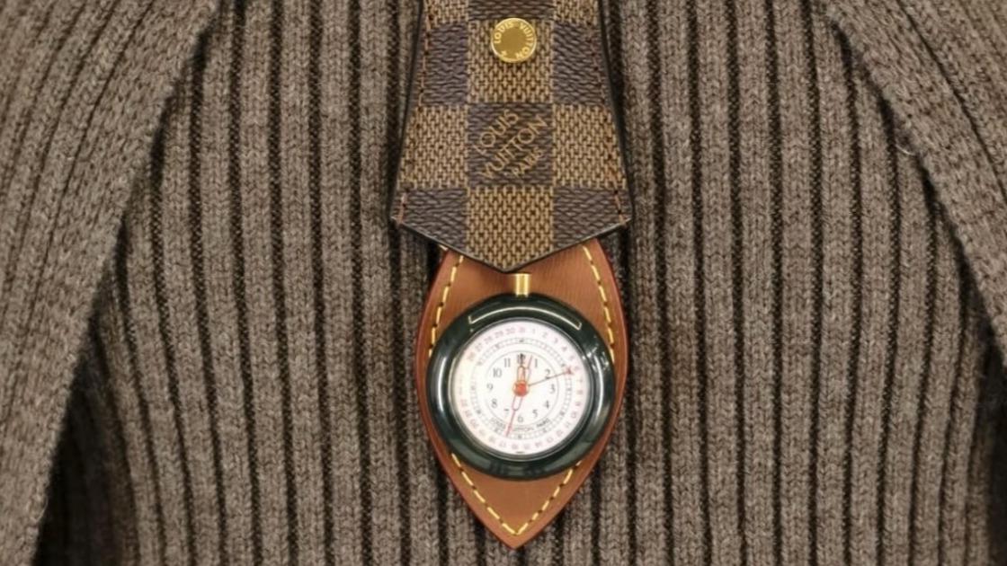 Rééditions ou bien pièces vintage ? Il s’agissait a priori de montres issues d’un stock de quelques dizaines de pièces retrouvées dans les archives de la maison. La forme et les couleurs ne trompent pas : ces Monterey sont des pièces à quartz datant du siècle dernier, au boîtier rond et à la couronne située à midi faciles à reconnaître. D’un diamètre de 37 mm, dotées d’étonnantes aiguilles « seringue » évidées, leur cadran blanc marqué « Louis Vuitton Paris» avec minuterie de chemin de fer pour les minutes, chiffres arabes pour les heures et indication de la date en périphérie en rouge correspondait bien au thème du défilé. Son absence de cornes en faisait également la candidate idéale pour un port en pendentif vintage dernière mode.