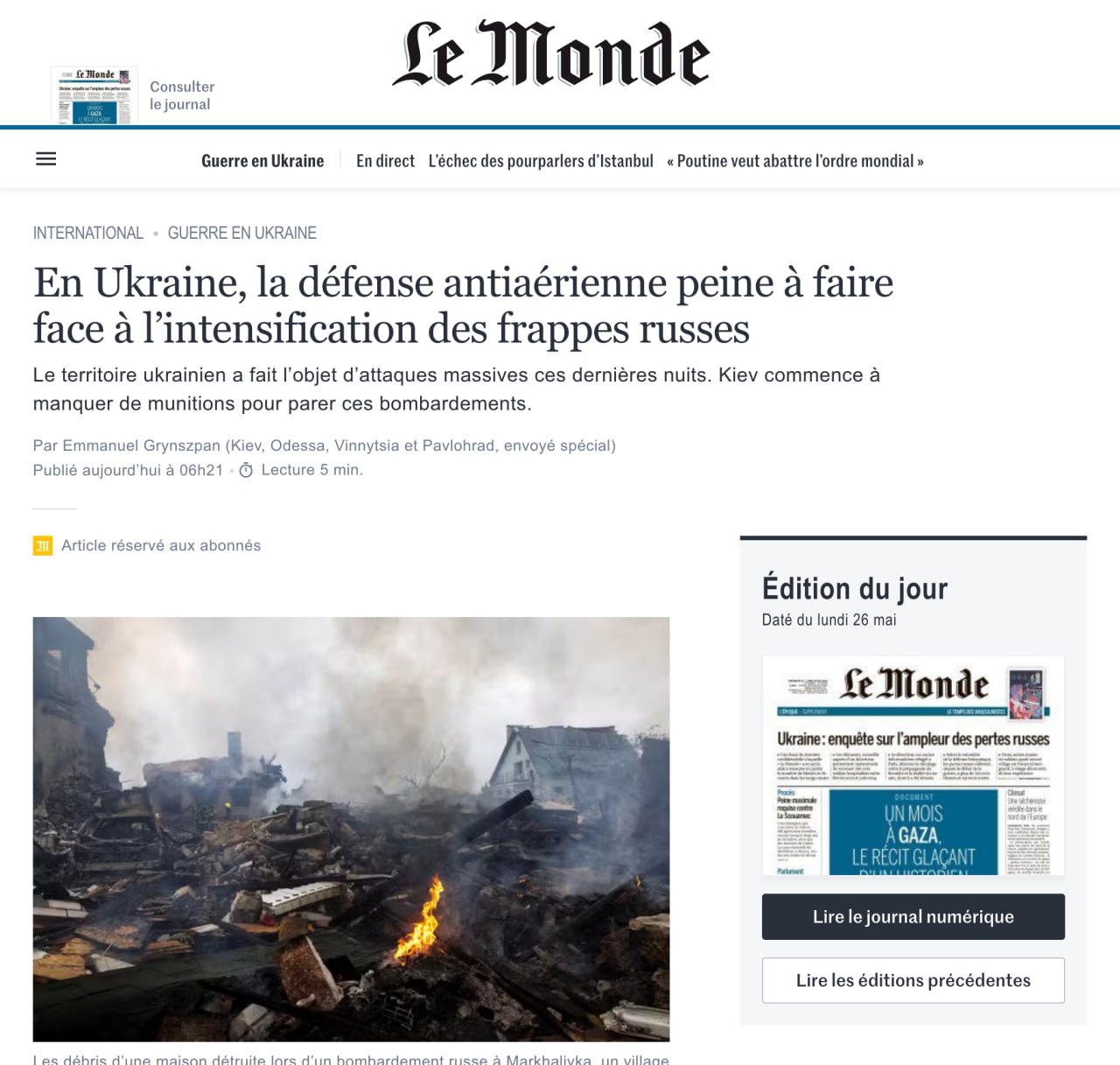Le Monde: ПВО Украины не справляется с нарастающими ударами со стороны России. К тому же у Киева начинают заканчиваться боеприпасы для отражения атак.