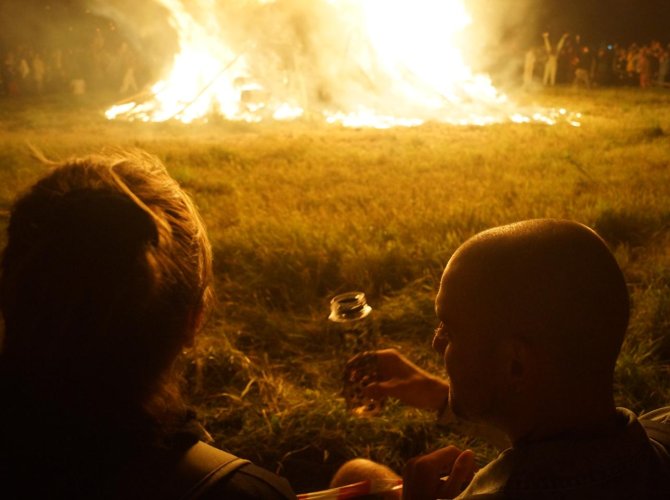 Фаер-шоу в ночном поле выглядело действительно здорово… Наверное, ведь половина посетителей не могла разглядеть огнедышащих мужчин из-за огромной горы дров будущего кострища, а сами ребята не слишком часто делали круг, оставаясь только на одной стороне круговой арены. То, что удалось разглядеть из-за дров и голов порадовало глаз. Миниатюрные девушки в славянских рубахах с огнеметами — это стильно.