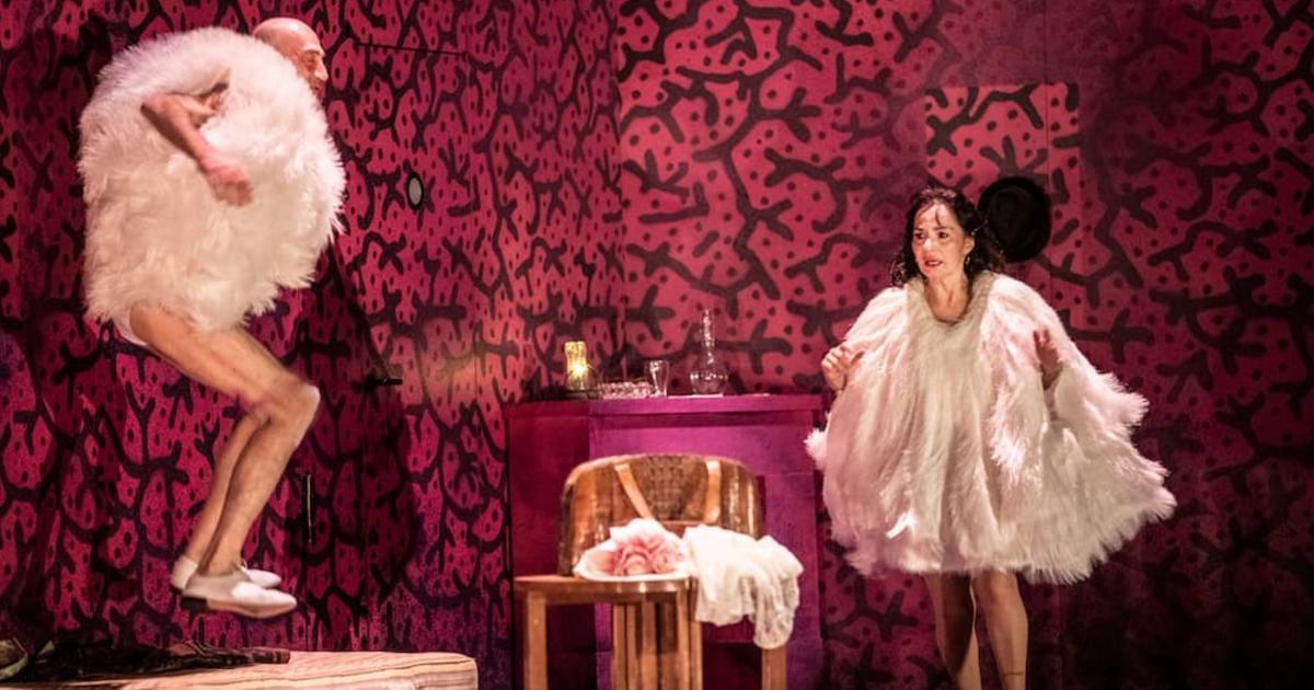 Les procédés comiques dont abuse Stanislas Nordey sont si systématiques et outranciers qu’ils laissent de marbre. Emportés malgré eux dans un tourbillon adultérin, les personnages tous campés formidablement devraient cavaler à l’envi mais, bridés, ils pédalent dans la choucroute sur un plateau trop vaste pour leur folie. Précisons qu’ils ne sont pas aidés par la scénographie, des murs recouverts de didascalies qu’on a le temps de lire au cours de la représentation qui s’étire sur deux heures et cinquante-cinq minutes, entracte compris. Ni par les costumes qui transforment les interprètes en volailles dès qu’ils sont dans l’hôtel borgne.