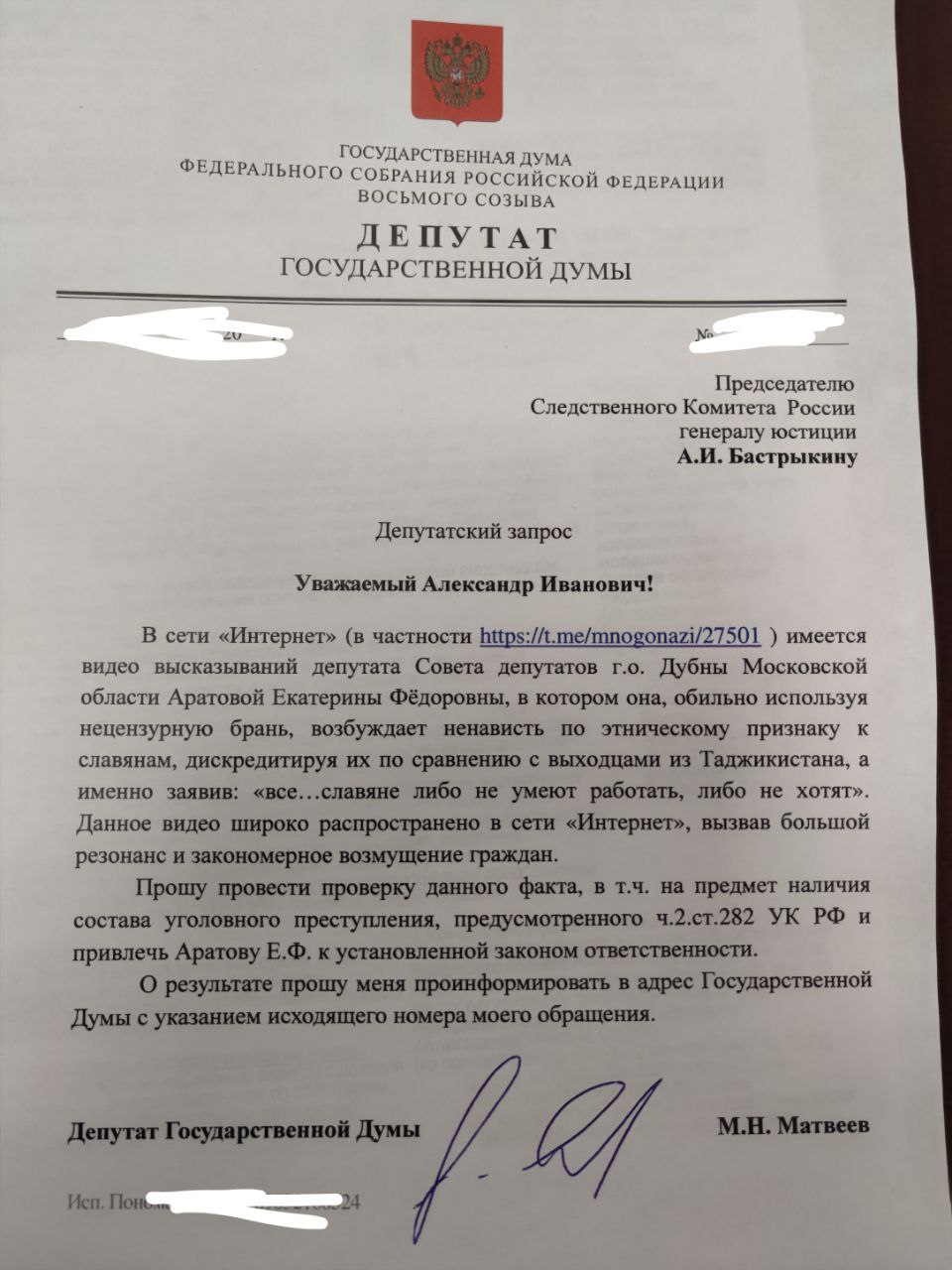 В связи с тем, что в своих "извинениях" депутатка Аратова не признаёт своей вины и не извиняется перед славянами, которых она обгадила своими лживыми и хамскими утверждениями, и сетует лишь на "эмоциональную форму " своего видео (это про подзаборный мат-перемат через слово), а руководство Думы Дубны, как мне пишут, встало на её защиту вместо осуждения, направляю в СК РФ обращение о проведении проверки и привлечении её к ответственности. О результате рассмотрения проинформирую.
