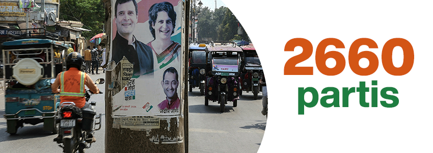 Démocratie multipartite, l'Inde compte environ 2 660 partis politiques enregistrés. C'est ainsi plus de 8 000 candidats qui vont tenter de briguer un mandat parlementaire sous les étiquettes de ces multiples groupes. En 2019, seuls 36 partis avaient réussi à envoyer au moins un représentant à la Lok Sabha.