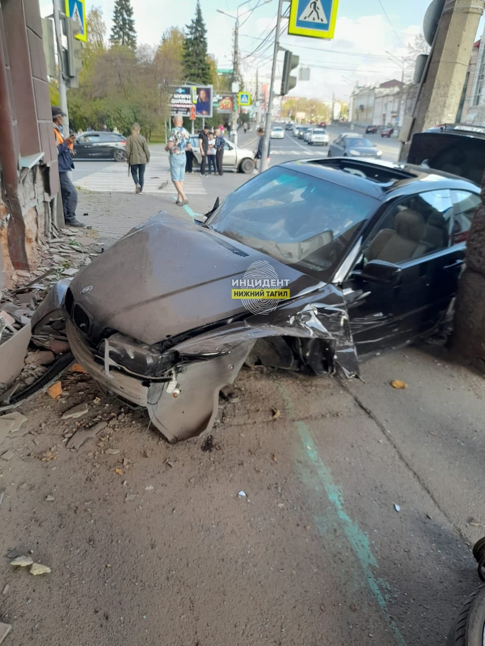 — На перекрестке Ленина — Огаркова сегодня случился серьезный замес... BMW впечаталась прямо в здание, а у Renault аж капот сорвало, — рассказал очевидец сообществу «Инцидент Нижний Тагил».