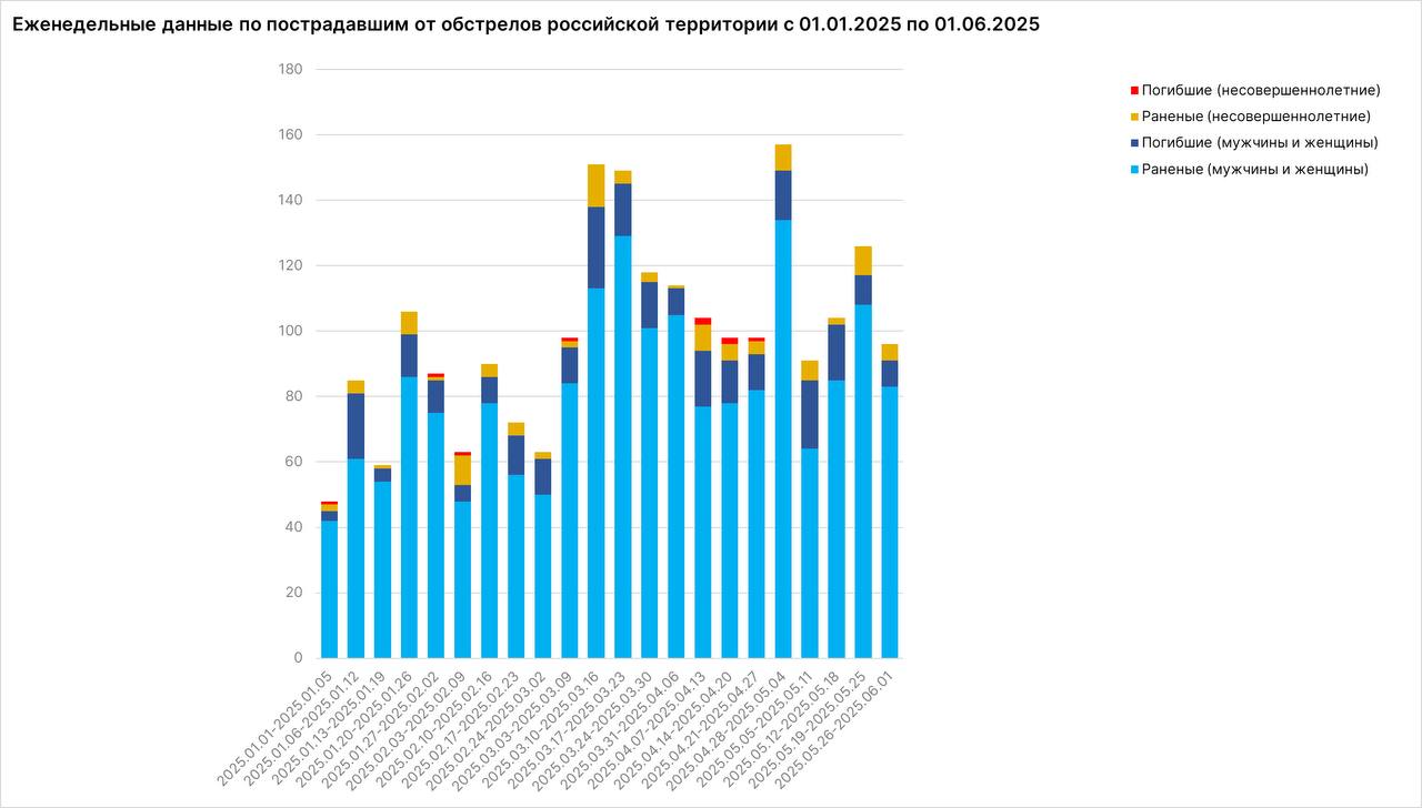 За неделю с 26 мая по 1 июня от обстрелов нацистов пострадали 96 мирных жителей: ранены 88 человек, в том числе 5 несовершеннолетних, погибли 8 человек. ВСУ выпустили не менее 1863 боеприпасов по гражданским объектам на российских территориях.