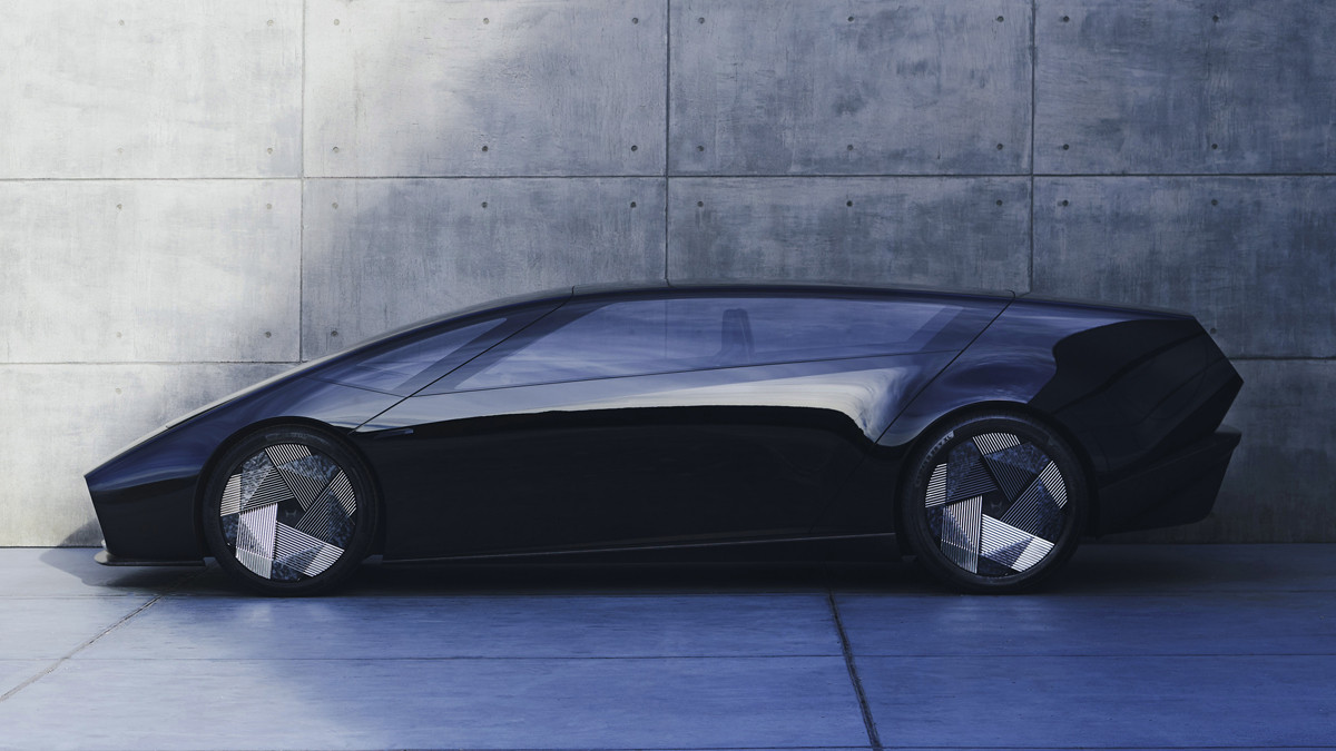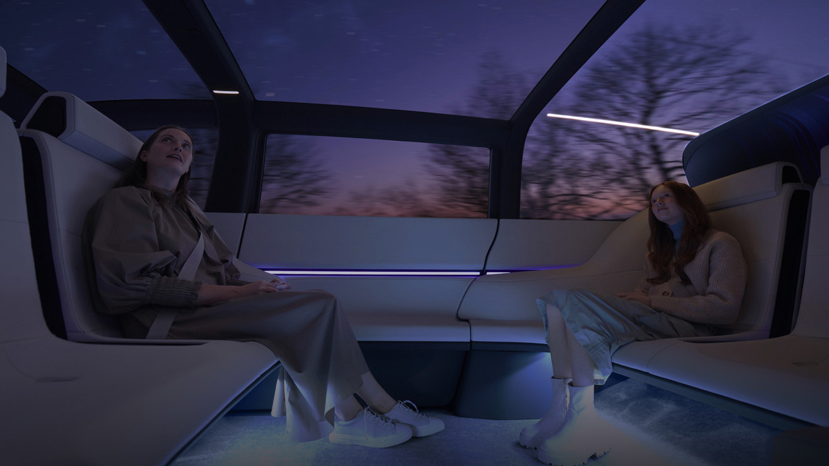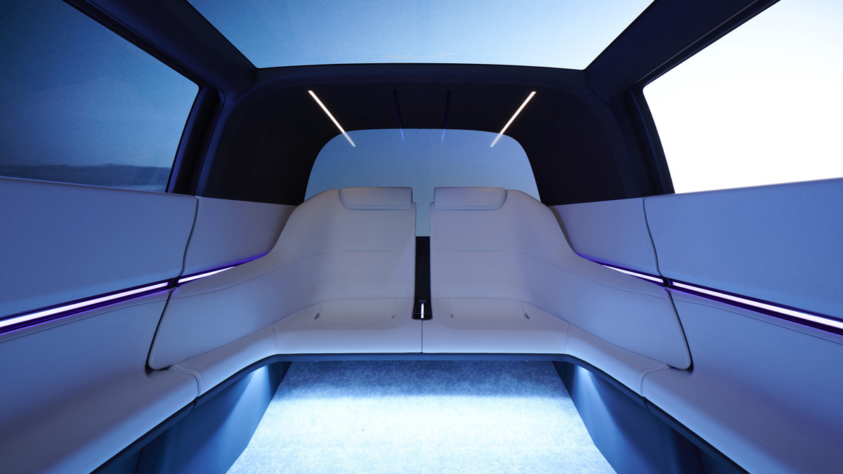 Ещё у этого концепта чёрные передние и центральные стойки, стеклянная крыша, а задняя часть электрокара глухая, стекла нет. По периметру кормы проходят светящиеся красным полосы, исполняющие роль фонарей. Ближе к центру заглушки сзади можно увидеть подсвеченное название бренда. Салон шоу-кара напоминает гостиную, а значит подходит в качестве места для отдыха, мобильного офиса или переговорной.