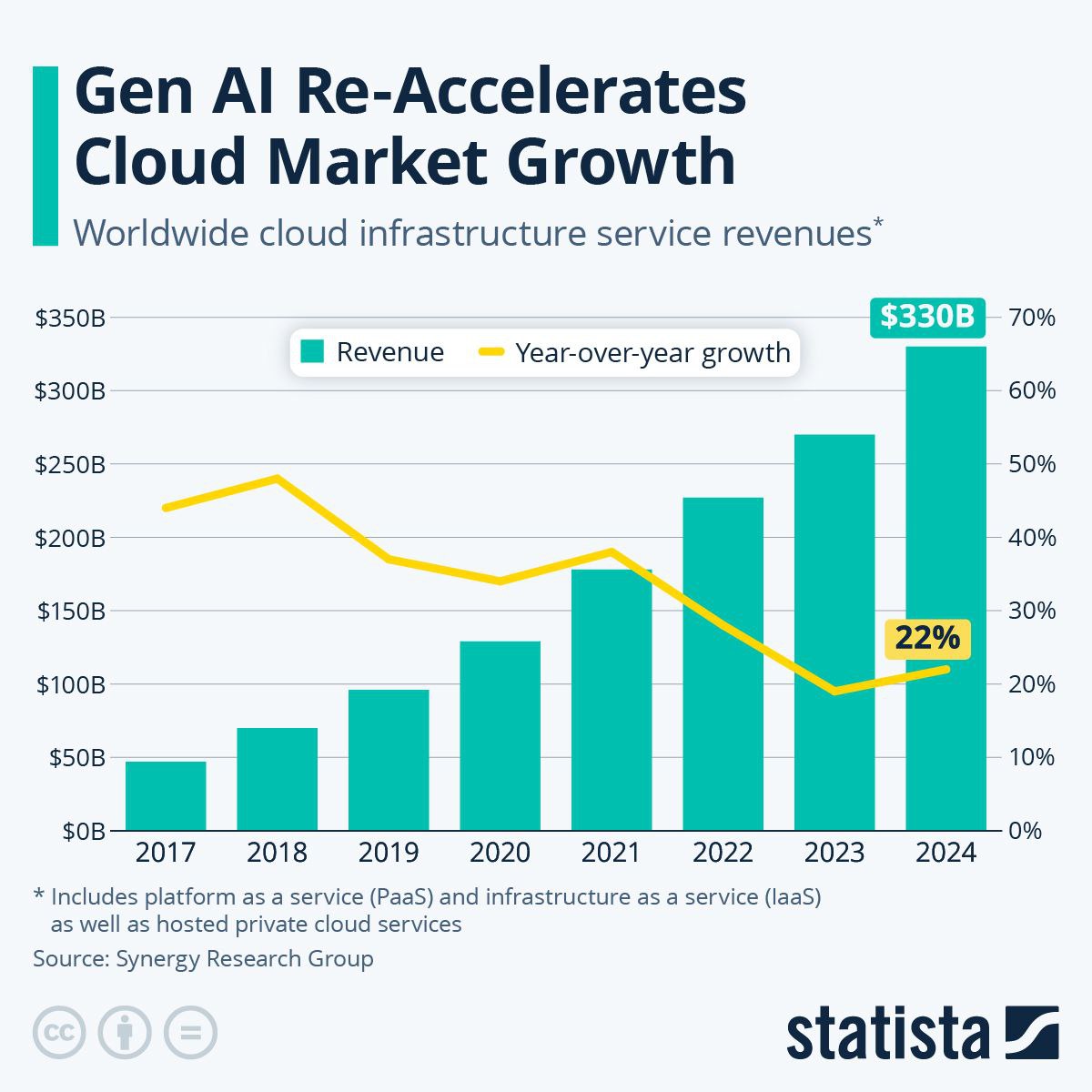 На диаграмме рост выручки глобальных услуг облачной инфраструктуры с 2017 года, где Amazon (AWS) занимает около 30% рынка.