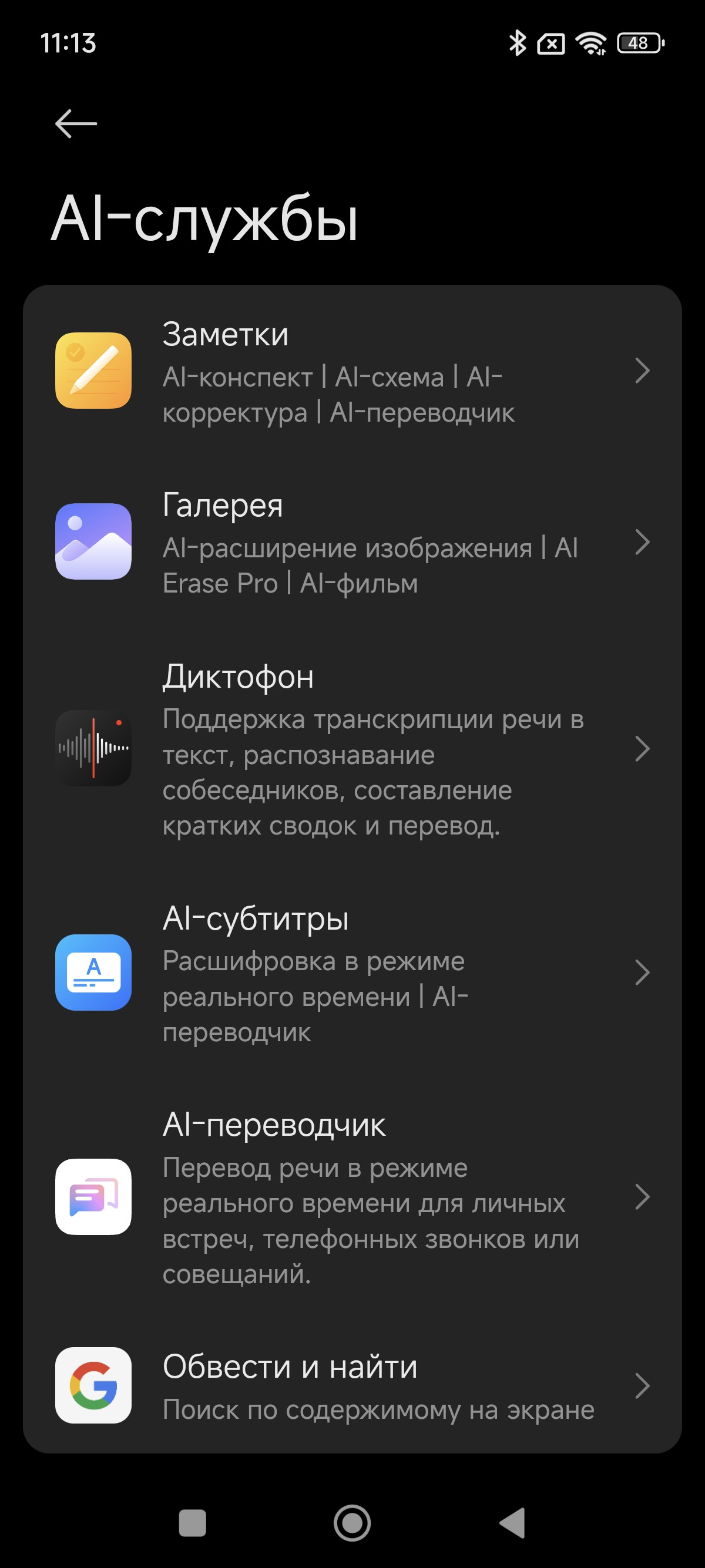 Кроме того, в девайсе есть ИИ-фишки: Gemini от Google, несколько разработок самой Xiaomi (как на скриншоте ниже). Но стоит учитывать: без VPN-соединения Gemini работать в Беларуси не будет. А, на мой взгляд, из представленных функций реально полезная лишь одна — «Обведи и найди». С ней запинок не случалось.