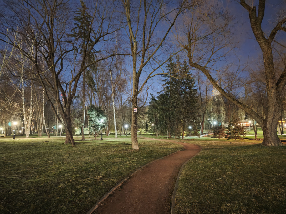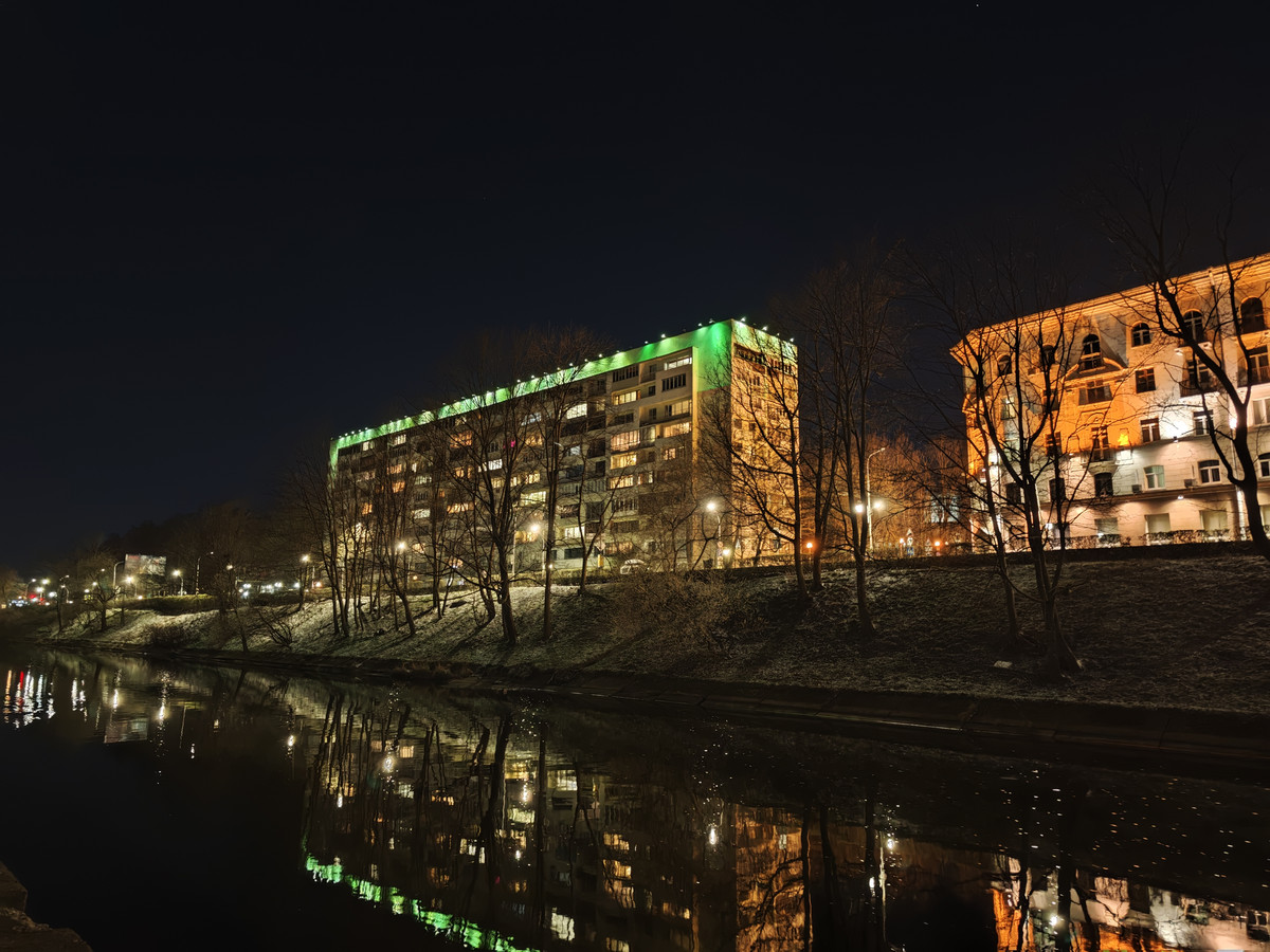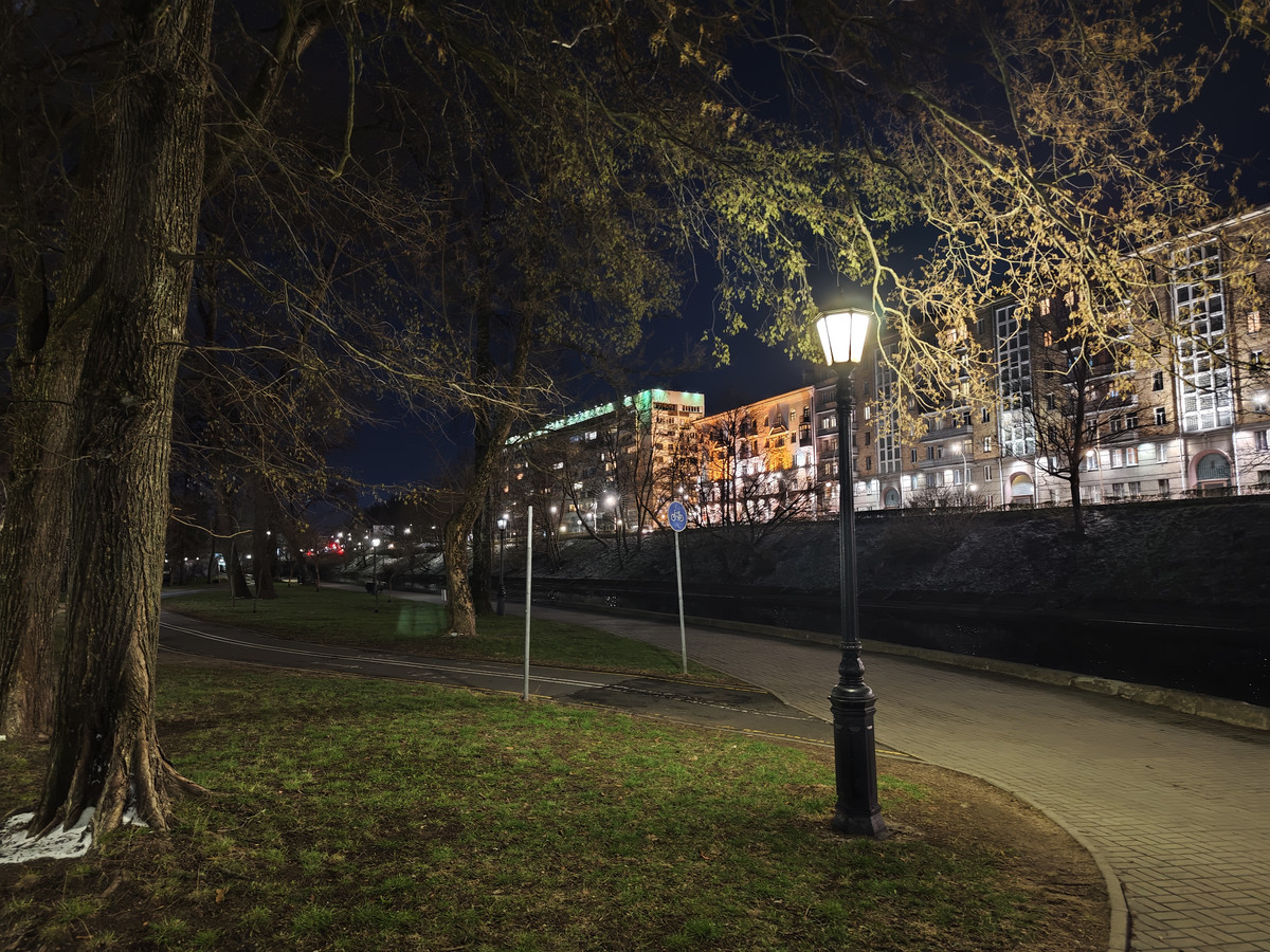 Вечерние кадры хорошо показывают себя в детализации в тенях, а еще хорошо обрабатывают блики от источников света — проще говоря, «узоров» от фонарных столбов практически нет. Последним часто грешат «айфоны».