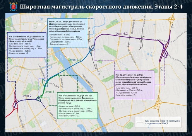 Широтная магистраль скоростного движения — главный дорожный проект Петербурга ближайших лет. Это платная трасса, первый ее этап в виде Витебской развязки ЗСД уже достраивается. Последующие три доведут ее шестиполосной дорогой практически до границы города. Второй этап — от Витебского до Софийской улицы (порядка 2 км), третий — до улицы 2-й Луч (примерно так же), этап 4.1 с мостом через Неву — до Союзного проспекта (около 4 км), этап 4.2.1 — до Российского проспекта (почти 3 км) и наконец этап 4.2.2 — до КАД (3,6 км).