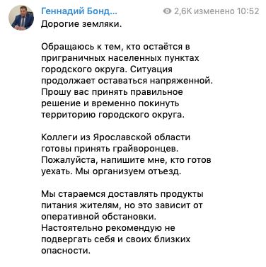 Власти Грайворона призвали жителей «принять правильное решение и временно покинуть территорию городского округа». Об этом заявил глава администрации Геннадий Бондарев. По его словам, желающих выехать грайворонцев готова принять Ярославская область. «Мы стараемся доставлять продукты питания жителям, но это зависит от оперативной обстановки. Настоятельно рекомендую не подвергать себя и своих близких опасности»,— отметил политик. По последним данным Минобороны РФ, группировка войск «Запад» поразила пункты временной дислокации украинских ДРГ в приграничном районе Белгородской области. @stormdaily