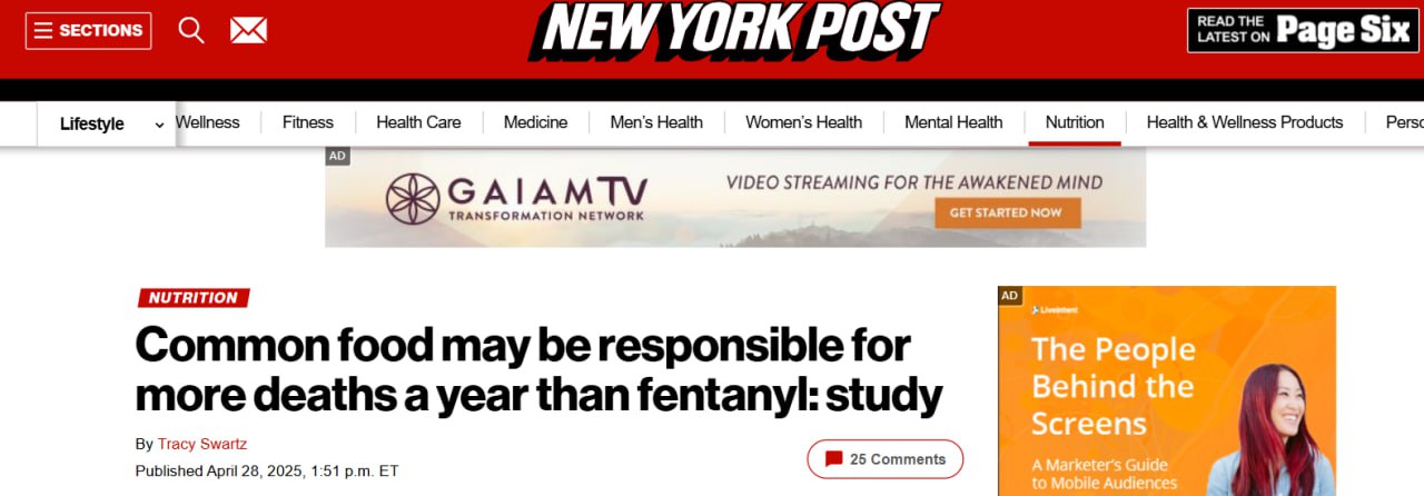 Обычная еда в США может быть причиной большего количества смертей в год, чем наркотик фентанил, сообщает New York Post со ссылкой на исследование.