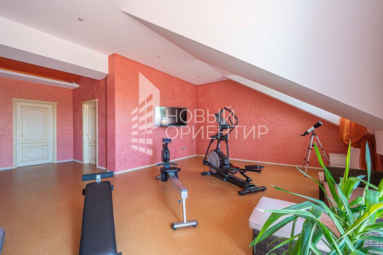 Мансардный этаж занимают спортзал и кинозал, еще одна жилая комната. Отсюда также есть выход на террасу, откуда открывается шикарный вид.