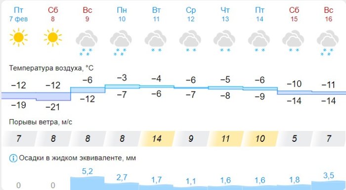 В понедельник, 10 числа, прогнозируют -3, -8 местами до -14°C ночью, а днём — от -4 до +1°C. Будут снег, метели, гололедные явления, ветер с порывами до 16 м/с. Сильный ветер до 22 м/с может обрушиться на регион во вторник. Далее похожая погода прогнозируется на почти всю следующую неделю.