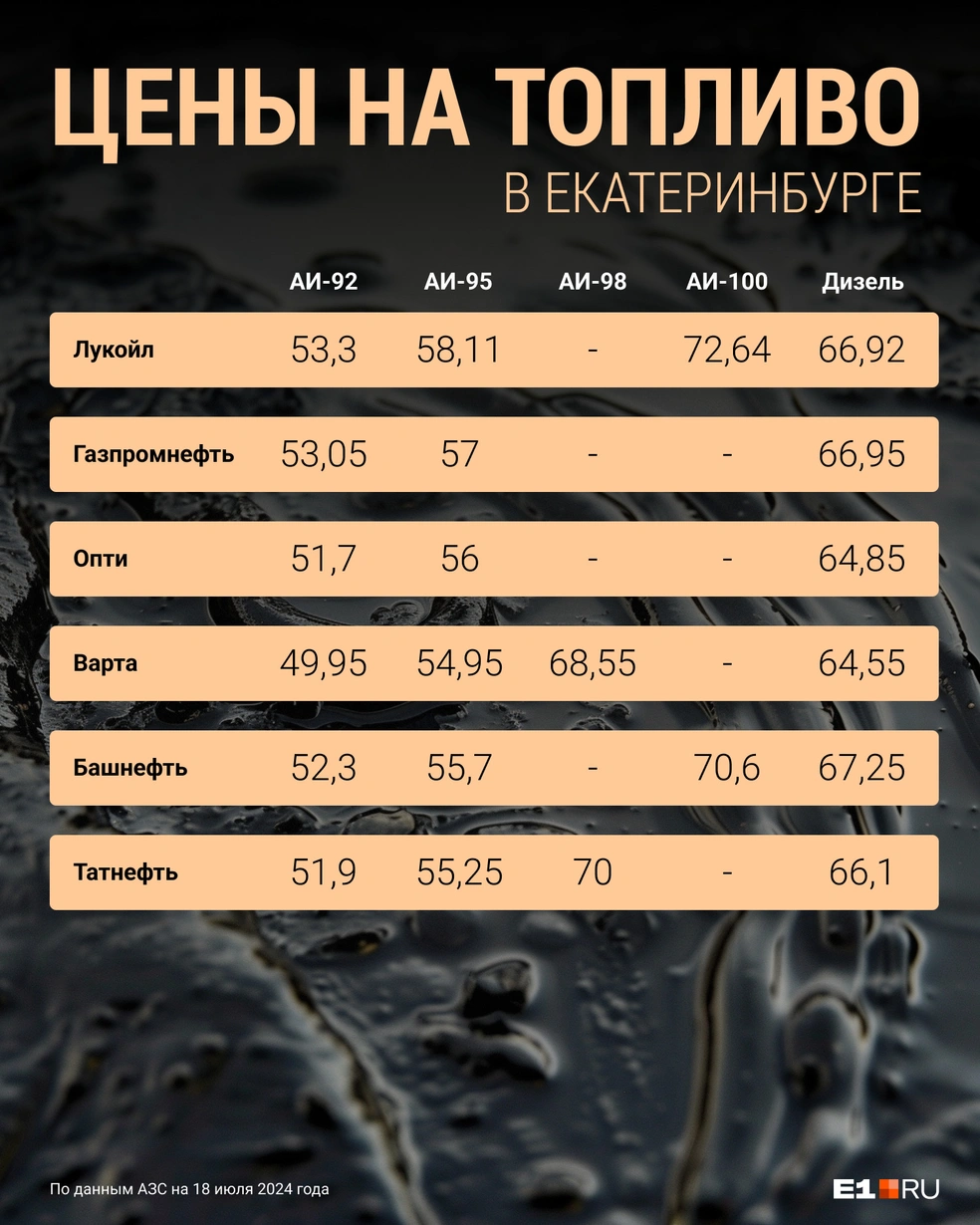 В Екатеринбурге не прекращают расти цены на топливо. К середине июля стоимость 92-го бензина на популярных заправках перевалила за 53 рубля, а за 95-й кое-где уже просят больше 58 рублей. Теперь E1.RU будет регулярно фиксировать цены на АЗС, чтобы посмотреть, как они меняются.