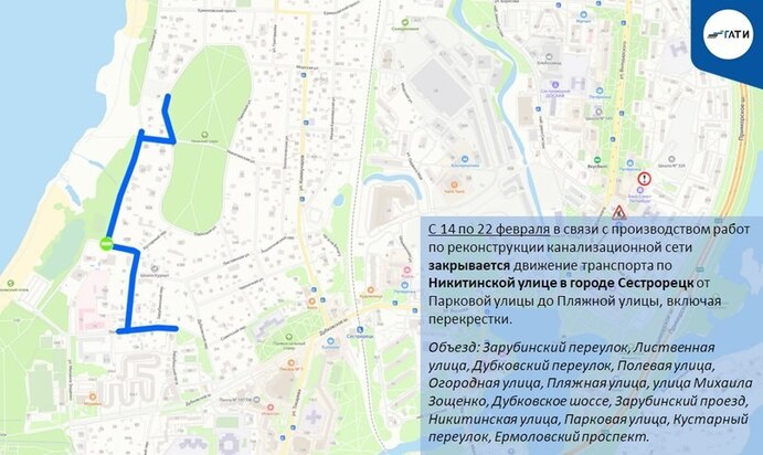 В Курортном районе закроют движение по Никитинской улице в Сестрорецке от Парковой улицы до Пляжной, включая перекрестки, до 22 февраля.