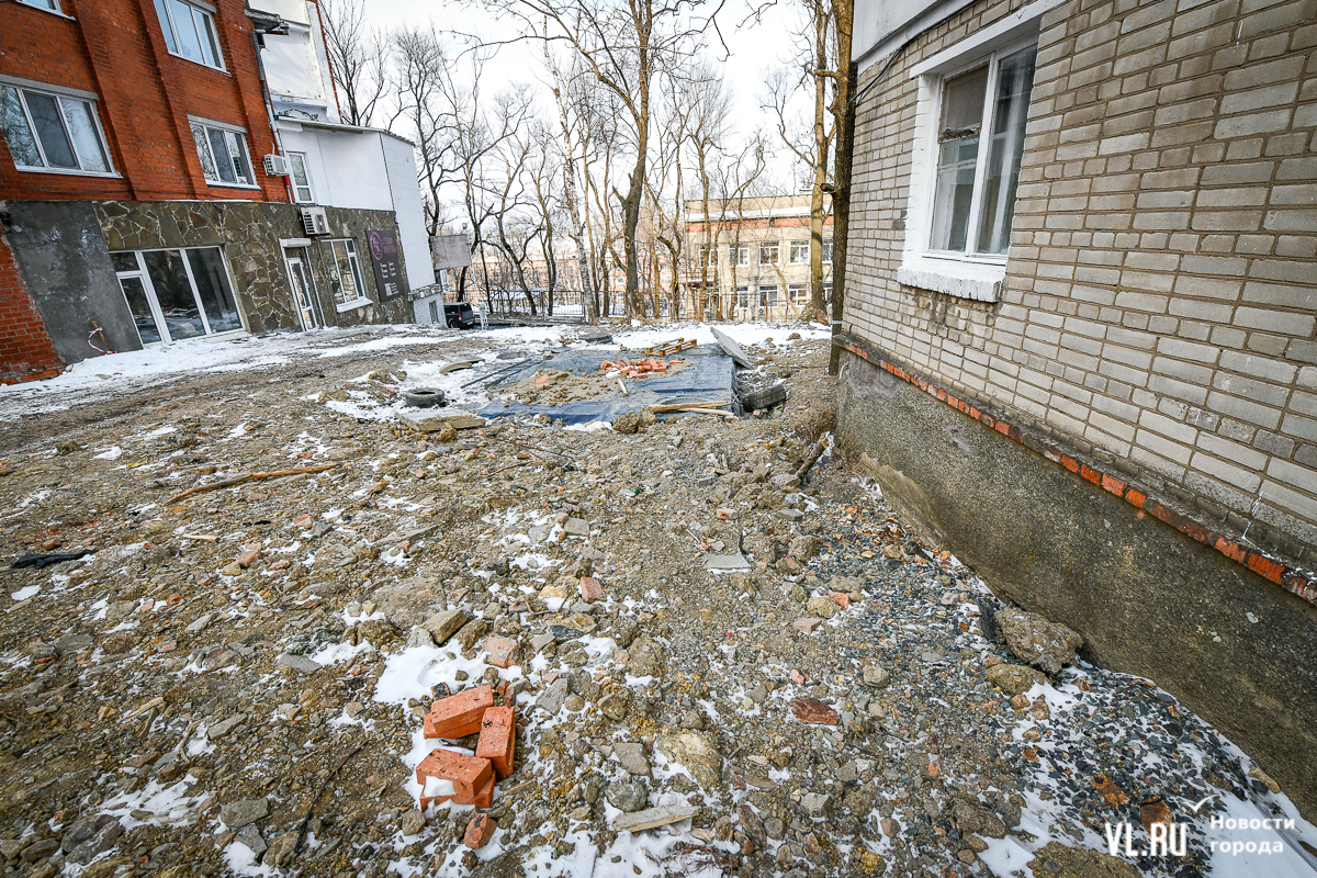 Двор между домами действительно впечатляет разрушениями. Позавчерашний снег присыпал раскопки, но под ним заметны обломки кирпичей и куски бетона, вместо брусчатки и асфальта насыпаны камни, щебень и глина. Вдоль дома под окнами вместо клумбы установили колодцы, но не огородили провалы, а прикрыли их досками.